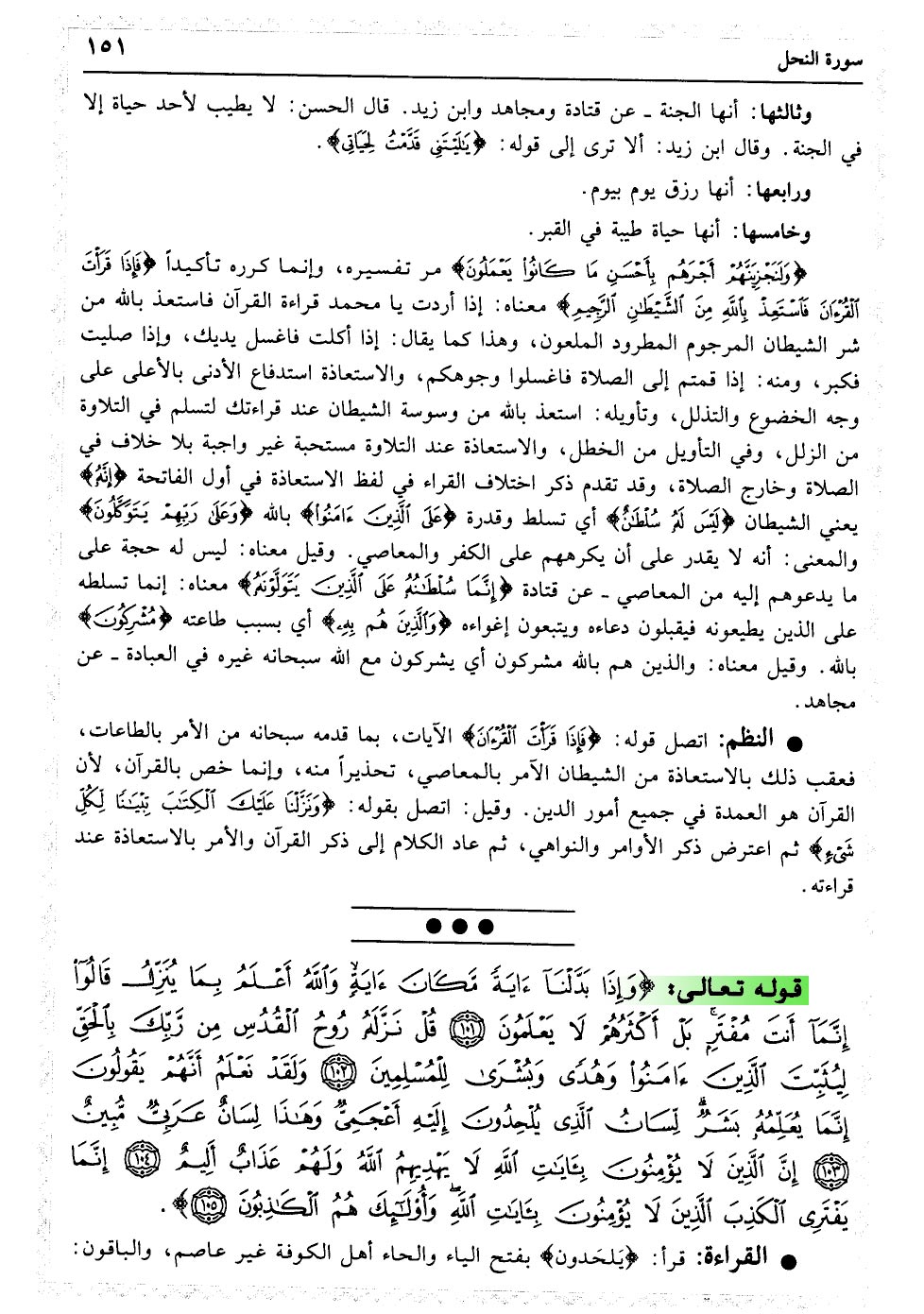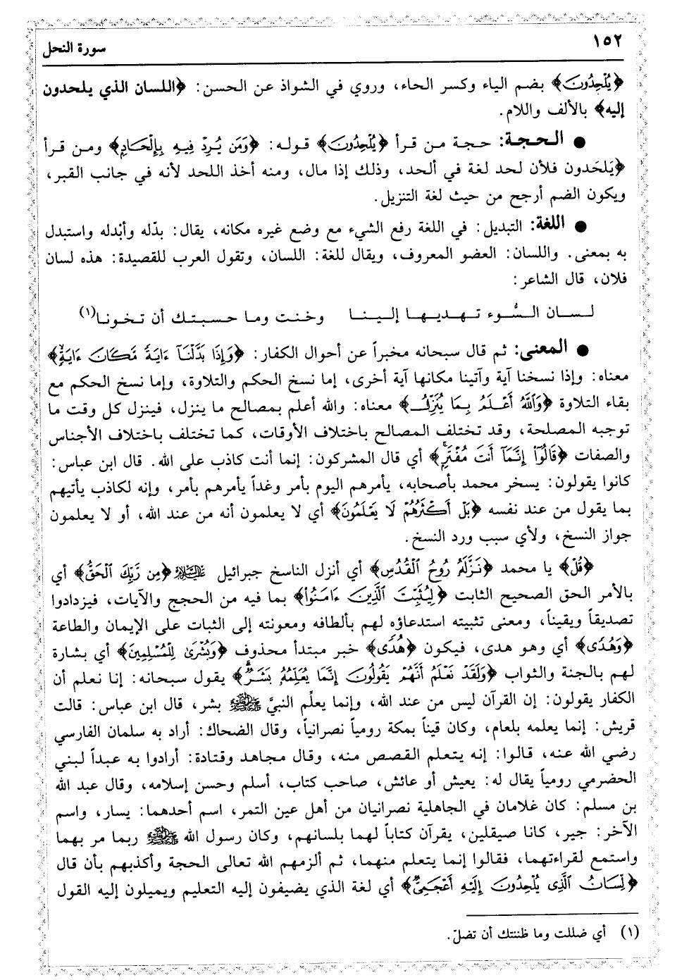وَإِذَا بَدَّلْنَا آیَةً مَکَانَ آیَةٍ وَاللَّهُ أَعْلَمُ بِمَا یُنَزِّلُ قَالُوا إِنَّمَا أَنْتَ مُفْتَرٍ بَلْ أَکْثَرُهُمْ لا یَعْلَمُونَ﴿۱۰۱﴾ قُلْ نَزَّلَهُ رُوحُ الْقُدُسِ مِنْ رَبِّکَ بِالْحَقِّ لِیُثَبِّتَ الَّذِینَ آمَنُوا وَهُدًی وَبُشْرَی لِلْمُسْلِمِینَ﴿۱۰۲﴾ وَلَقَدْ نَعْلَمُ أَنَّهُمْ یَقُولُونَ إِنَّمَا یُعَلِّمُهُ بَشَرٌ لِسَانُ الَّذِی یُلْحِدُونَ إِلَیْهِ أَعْجَمِیٌّ وَهَذَا لِسَانٌ عَرَبِیٌّ مُبِینٌ﴿۱۰۳﴾ إِنَّ الَّذِینَ لا یُؤْمِنُونَ بِآیَاتِ اللَّهِ لا یَهْدِیهِمُ اللَّهُ وَلَهُمْ عَذَابٌ أَلِیمٌ﴿۱۰۴﴾ إِنَّمَا یَفْتَرِی الْکَذِبَ الَّذِینَ لا یُؤْمِنُونَ بِآیَاتِ اللَّهِ وَأُولَئِکَ هُمُ الْکَاذِبُونَ﴿۱۰۵﴾