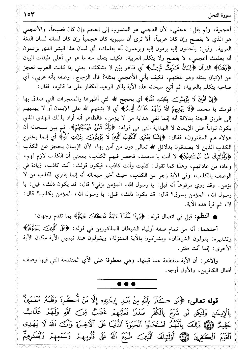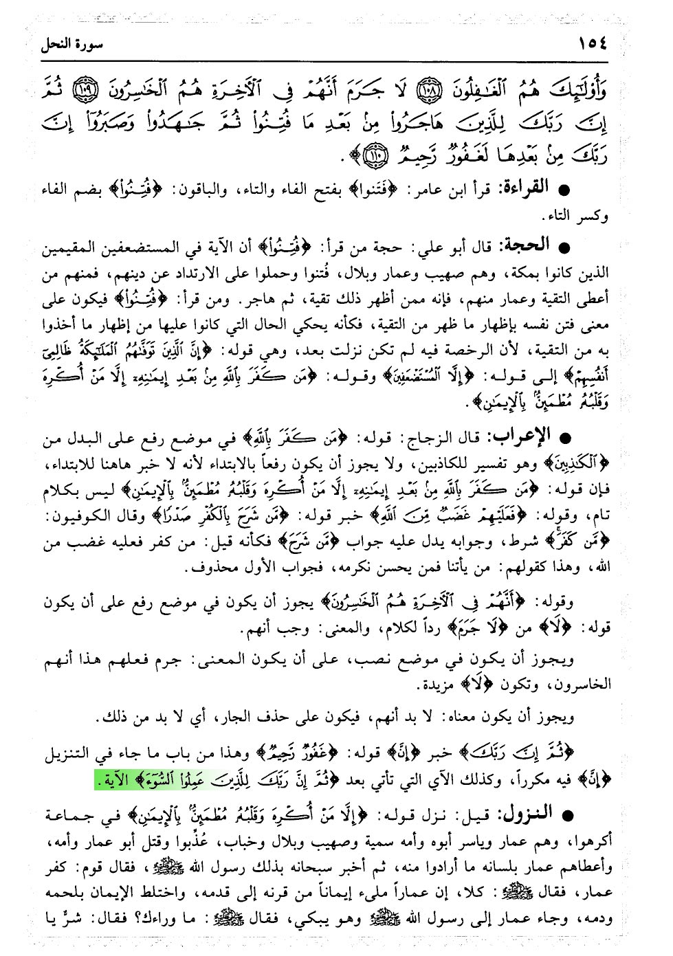مَنْ کَفَرَ بِاللَّهِ مِنْ بَعْدِ إِیمَانِهِ إِلا مَنْ أُکْرِهَ وَقَلْبُهُ مُطْمَئِنٌّ بِالإیمَانِ وَلَکِنْ مَنْ شَرَحَ بِالْکُفْرِ صَدْرًا فَعَلَیْهِمْ غَضَبٌ مِنَ اللَّهِ وَلَهُمْ عَذَابٌ عَظِیمٌ﴿۱۰۶﴾ ذَلِکَ بِأَنَّهُمُ اسْتَحَبُّوا الْحَیَاةَ الدُّنْیَا عَلَی الآخِرَةِ وَأَنَّ اللَّهَ لا یَهْدِی الْقَوْمَ الْکَافِرِینَ﴿۱۰۷﴾ أُولَئِکَ الَّذِینَ طَبَعَ اللَّهُ عَلَی قُلُوبِهِمْ وَسَمْعِهِمْ وَأَبْصَارِهِمْ وَأُولَئِکَ هُمُ الْغَافِلُونَ﴿۱۰۸﴾ لا جَرَمَ أَنَّهُمْ فِی الآخِرَةِ هُمُ الْخَاسِرُونَ﴿۱۰۹﴾ ثُمَّ إِنَّ رَبَّکَ لِلَّذِینَ هَاجَرُوا مِنْ بَعْدِ مَا فُتِنُوا ثُمَّ جَاهَدُوا وَصَبَرُوا إِنَّ رَبَّکَ مِنْ بَعْدِهَا لَغَفُورٌ رَحِیمٌ﴿۱۱۰﴾