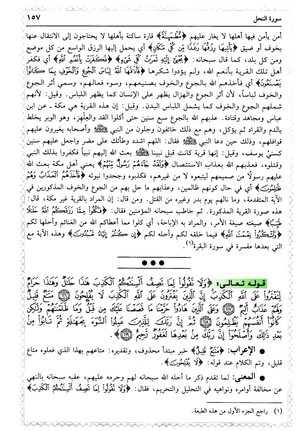 وَلا تَقُولُوا لِمَا تَصِفُ أَلْسِنَتُکُمُ الْکَذِبَ هَذَا حَلالٌ وَهَذَا حَرَامٌ لِتَفْتَرُوا عَلَی اللَّهِ الْکَذِبَ إِنَّ الَّذِینَ یَفْتَرُونَ عَلَی اللَّهِ الْکَذِبَ لا یُفْلِحُونَ﴿۱۱۶﴾ مَتَاعٌ قَلِیلٌ وَلَهُمْ عَذَابٌ أَلِیمٌ﴿۱۱۷﴾ وَعَلَی الَّذِینَ هَادُوا حَرَّمْنَا مَا قَصَصْنَا عَلَیْکَ مِنْ قَبْلُ وَمَا ظَلَمْنَاهُمْ وَلَکِنْ کَانُوا أَنْفُسَهُمْ یَظْلِمُونَ﴿۱۱۸﴾ ثُمَّ إِنَّ رَبَّکَ لِلَّذِینَ عَمِلُوا السُّوءَ بِجَهَالَةٍ ثُمَّ تَابُوا مِنْ بَعْدِ ذَلِکَ وَأَصْلَحُوا إِنَّ رَبَّکَ مِنْ بَعْدِهَا لَغَفُورٌ رَحِیمٌ﴿۱۱۹﴾