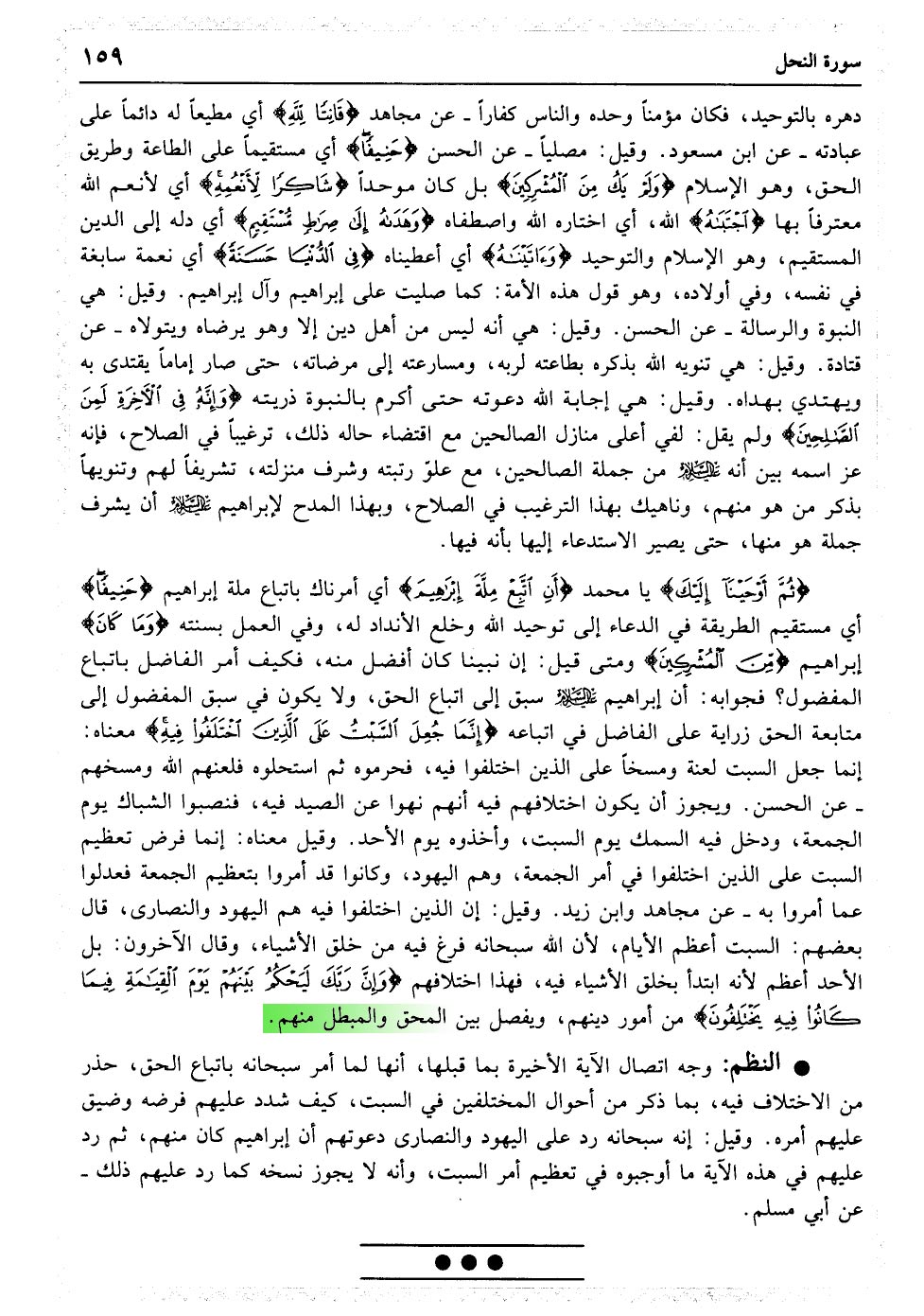 إِنَّ إِبْرَاهِیمَ کَانَ أُمَّةً قَانِتًا لِلَّهِ حَنِیفًا وَلَمْ یَکُ مِنَ الْمُشْرِکِینَ﴿۱۲۰﴾ شَاکِرًا لأنْعُمِهِ اجْتَبَاهُ وَهَدَاهُ إِلَی صِرَاطٍ مُسْتَقِیمٍ﴿۱۲۱﴾ وَآتَیْنَاهُ فِی الدُّنْیَا حَسَنَةً وَإِنَّهُ فِی الآخِرَةِ لَمِنَ الصَّالِحِینَ﴿۱۲۲﴾ ثُمَّ أَوْحَیْنَا إِلَیْکَ أَنِ اتَّبِعْ مِلَّةَ إِبْرَاهِیمَ حَنِیفًا وَمَا کَانَ مِنَ الْمُشْرِکِینَ﴿۱۲۳﴾ إِنَّمَا جُعِلَ السَّبْتُ عَلَی الَّذِینَ اخْتَلَفُوا فِیهِ وَإِنَّ رَبَّکَ لَیَحْکُمُ بَیْنَهُمْ یَوْمَ الْقِیَامَةِ فِیمَا کَانُوا فِیهِ یَخْتَلِفُونَ﴿۱۲۴﴾