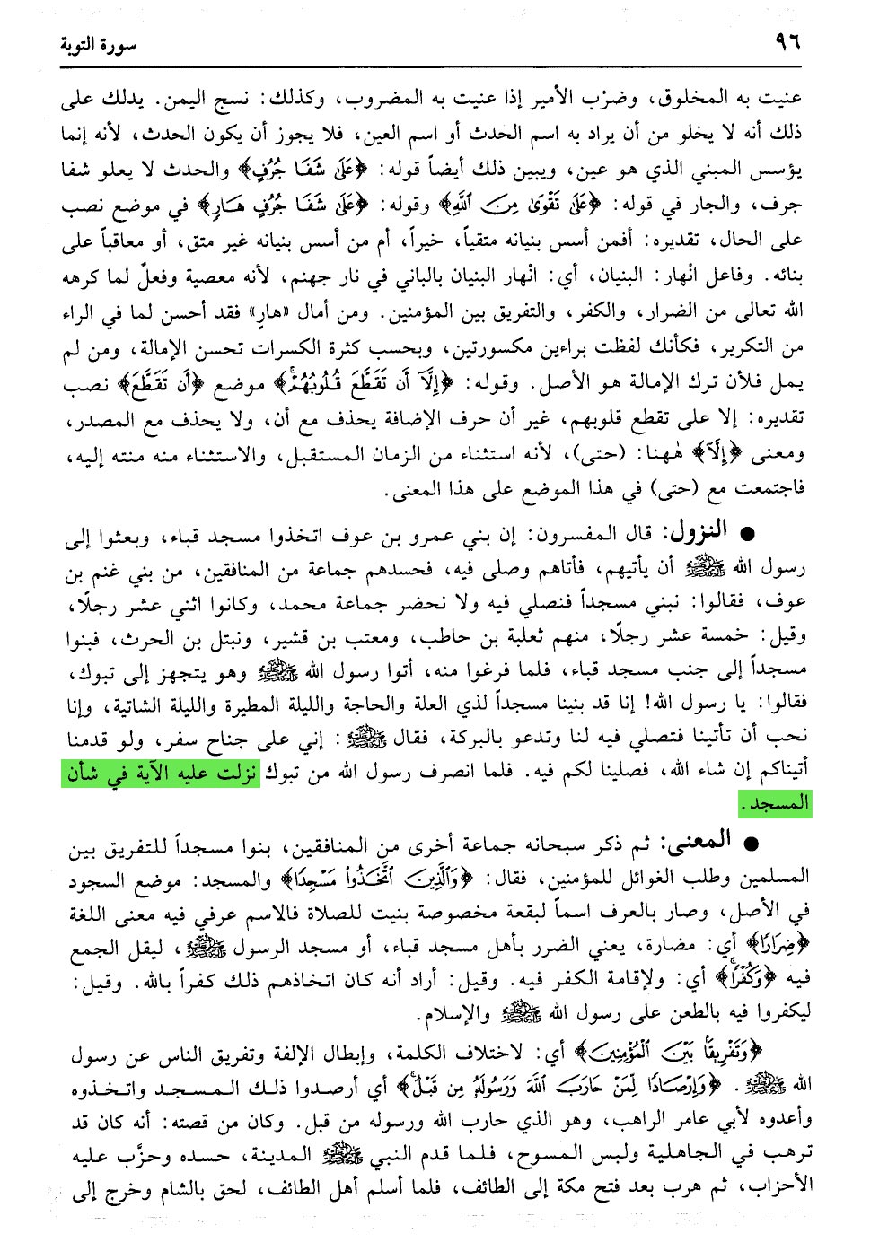وَالَّذِینَ اتَّخَذُوا مَسْجِدًا ضِرَارًا وَکُفْرًا وَتَفْرِیقًا بَیْنَ الْمُؤْمِنِینَ وَإِرْصَادًا لِمَنْ حَارَبَ اللَّهَ وَرَسُولَهُ مِنْ قَبْلُ وَلَیَحْلِفُنَّ إِنْ أَرَدْنَا إِلَّا الْحُسْنَی وَاللَّهُ یَشْهَدُ إِنَّهُمْ لَکَاذِبُونَ﴿۱۰۷﴾ لَا تَقُمْ فِیهِ أَبَدًا لَمَسْجِدٌ أُسِّسَ عَلَی التَّقْوَی مِنْ أَوَّلِ یَوْمٍ أَحَقُّ أَنْ تَقُومَ فِیهِ فِیهِ رِجَالٌ یُحِبُّونَ أَنْ یَتَطَهَّرُوا وَاللَّهُ یُحِبُّ الْمُطَّهِّرِینَ﴿۱۰۸﴾ أَفَمَنْ أَسَّسَ بُنْیَانَهُ عَلَی تَقْوَی مِنَ اللَّهِ وَرِضْوَانٍ خَیْرٌ أَمْ مَنْ أَسَّسَ بُنْیَانَهُ عَلَی شَفَا جُرُفٍ هَارٍ فَانْهَارَ بِهِ فِی نَارِ جَهَنَّمَ وَاللَّهُ لَا یَهْدِی الْقَوْمَ الظَّالِمِینَ﴿۱۰۹﴾ لَا یَزَالُ بُنْیَانُهُمُ الَّذِی بَنَوْا رِیبَةً فِی قُلُوبِهِمْ إِلَّا أَنْ تَقَطَعَ قُلُوبُهُمْ وَاللَهُ عَلِیمٌ حَکِیمٌ﴿۱۱۰﴾
