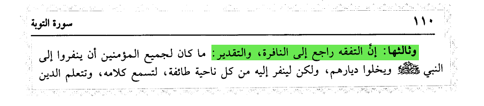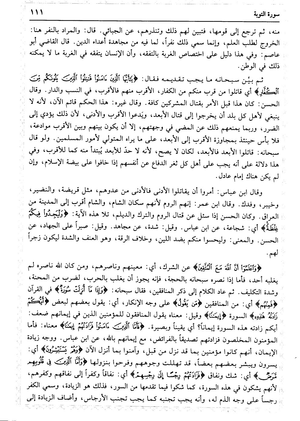 وَمَا کَانَ الْمُؤْمِنُونَ لِیَنْفِرُوا کَافَّةً فَلَوْلَا نَفَرَ مِنْ کُلِّ فِرْقَةٍ مِنْهُمْ طَائِفَةٌ لِیَتَفَقَّهُوا فِی الدِّینِ وَلِیُنْذِرُوا قَوْمَهُمْ إِذَا رَجَعُوا إِلَیْهِمْ لَعَلَّهُمْ یَحْذَرُونَ﴿۱۲۲﴾ یَا أَیُّهَا الَّذِینَ آمَنُوا قَاتِلُوا الَّذِینَ یَلُونَکُمْ مِنَ الْکُفَّارِ وَلْیَجِدُوا فِیکُمْ غِلْظَةً وَاعْلَمُوا أَنَّ اللَّهَ مَعَ الْمُتَّقِینَ﴿۱۲۳﴾ وَإِذَا مَا أُنْزِلَتْ سُورَةٌ فَمِنْهُمْ مَنْ یَقُولُ أَیُّکُمْ زَادَتْهُ هَذِهِ إِیمَانًا فَأَمَّا الَّذِینَ آمَنُوا فَزَادَتْهُمْ إِیمَانًا وَهُمْ یَسْتَبْشِرُونَ﴿۱۲۴﴾ وَأَمَا الَذِینَ فِی قُلُوبِهِمْ مَرَضٌ فَزَادَتْهُمْ رِجْسًا إِلَی رِجْسِهِمْ وَمَاتُوا وَهُمْ کَافِرُونَ﴿۱۲۵﴾