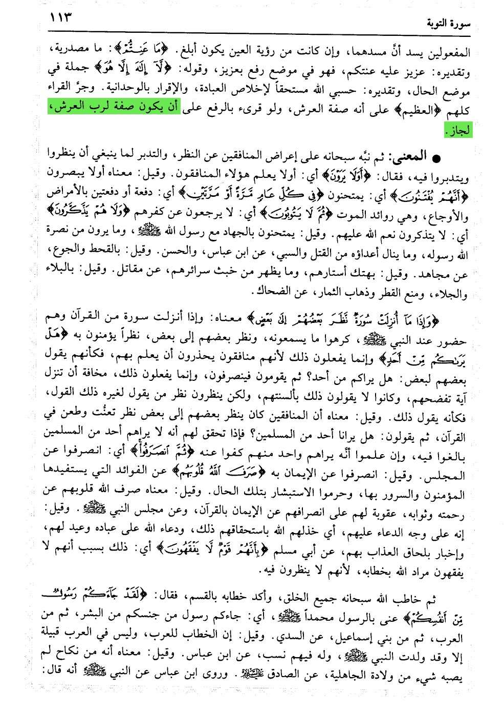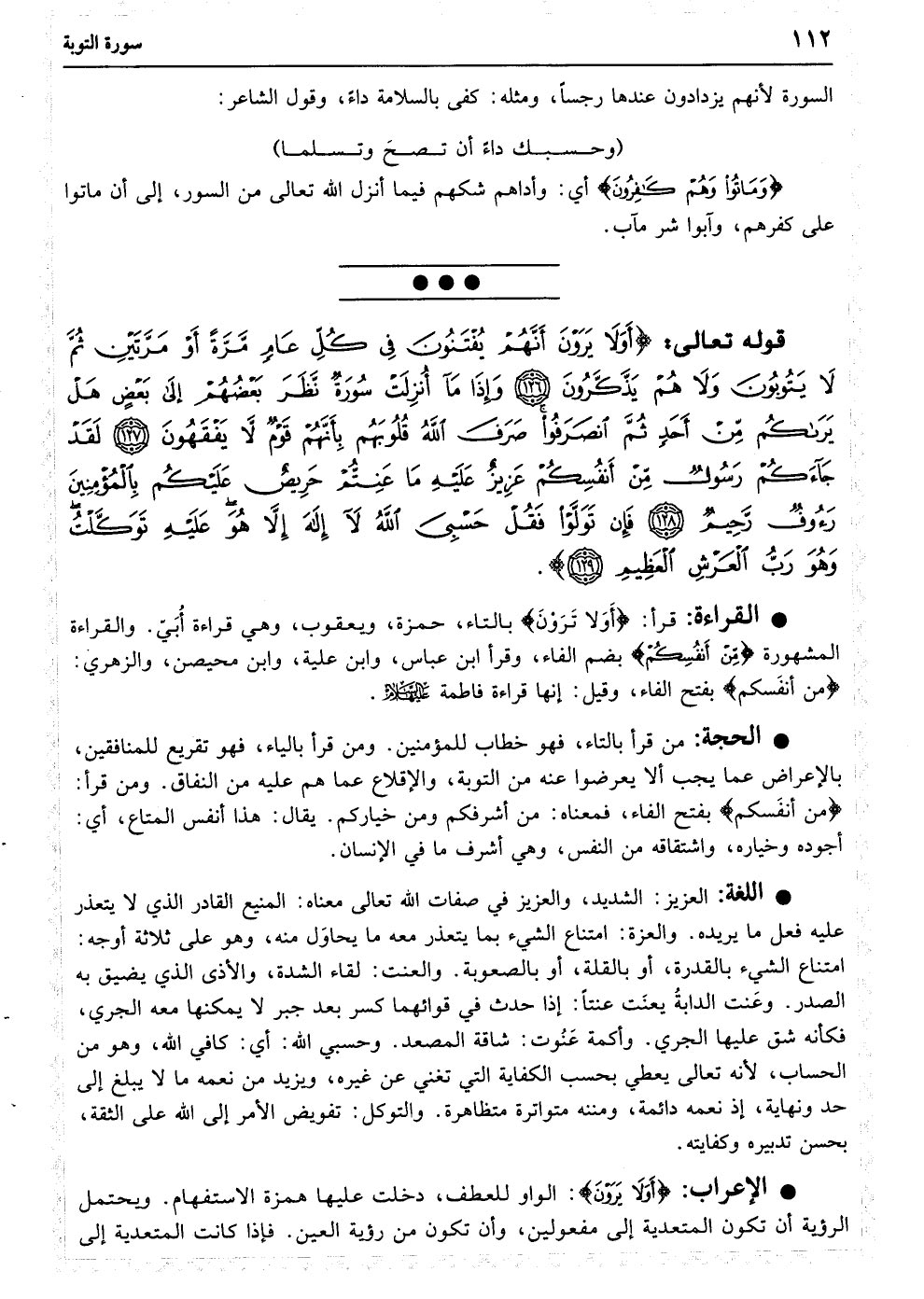 أَوَلَا یَرَوْنَ أَنَّهُمْ یُفْتَنُونَ فِی کُلِّ عَامٍ مَرَّةً أَوْ مَرَّتَیْنِ ثُمَّ لَا یَتُوبُونَ وَلَا هُمْ یَذَّکَّرُونَ﴿۱۲۶﴾ وَإِذَا مَا أُنْزِلَتْ سُورَةٌ نَظَرَ بَعْضُهُمْ إِلَی بَعْضٍ هَلْ یَرَاکُمْ مِنْ أَحَدٍ ثُمَّ انْصَرَفُوا صَرَفَ اللَّهُ قُلُوبَهُمْ بِأَنَّهُمْ قَوْمٌ لَا یَفْقَهُونَ﴿۱۲۷﴾ لَقَدْ جَاءَکُمْ رَسُولٌ مِنْ أَنْفُسِکُمْ عَزِیزٌ عَلَیْهِ مَا عَنِتُّمْ حَرِیصٌ عَلَیْکُمْ بِالْمُؤْمِنِینَ رَءُوفٌ رَحِیمٌ﴿۱۲۸﴾ فَإِنْ تَوَلَّوْا فَقُلْ حَسْبِیَ اللَّهُ لَا إِلَهَ إِلَّا هُوَ عَلَیْهِ تَوَکَّلْتُ وَهُوَ رَبُ الْعَرْشِ الْعَظِیمِ﴿۱۲۹﴾