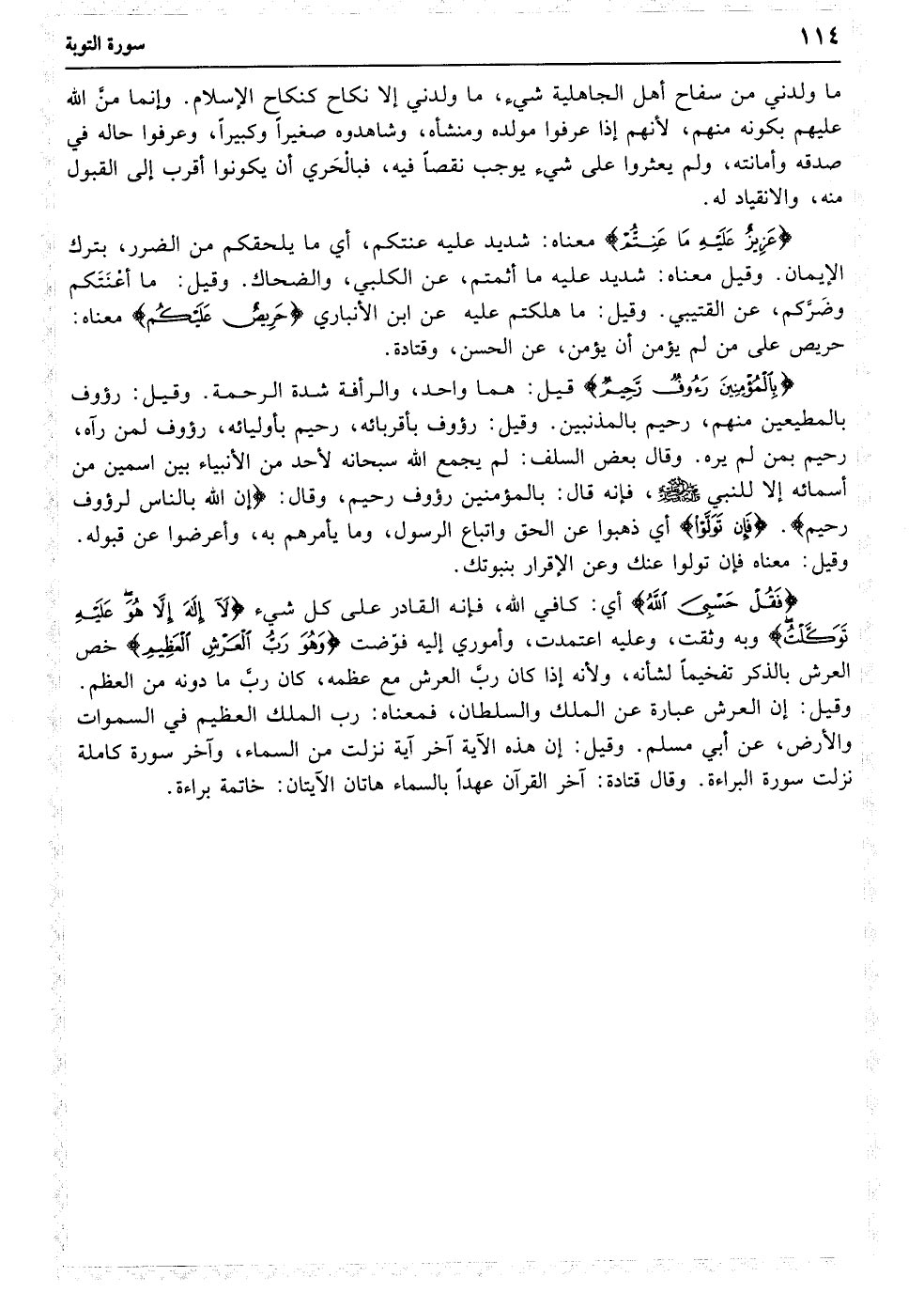 أَوَلَا یَرَوْنَ أَنَّهُمْ یُفْتَنُونَ فِی کُلِّ عَامٍ مَرَّةً أَوْ مَرَّتَیْنِ ثُمَّ لَا یَتُوبُونَ وَلَا هُمْ یَذَّکَّرُونَ﴿۱۲۶﴾ وَإِذَا مَا أُنْزِلَتْ سُورَةٌ نَظَرَ بَعْضُهُمْ إِلَی بَعْضٍ هَلْ یَرَاکُمْ مِنْ أَحَدٍ ثُمَّ انْصَرَفُوا صَرَفَ اللَّهُ قُلُوبَهُمْ بِأَنَّهُمْ قَوْمٌ لَا یَفْقَهُونَ﴿۱۲۷﴾ لَقَدْ جَاءَکُمْ رَسُولٌ مِنْ أَنْفُسِکُمْ عَزِیزٌ عَلَیْهِ مَا عَنِتُّمْ حَرِیصٌ عَلَیْکُمْ بِالْمُؤْمِنِینَ رَءُوفٌ رَحِیمٌ﴿۱۲۸﴾ فَإِنْ تَوَلَّوْا فَقُلْ حَسْبِیَ اللَّهُ لَا إِلَهَ إِلَّا هُوَ عَلَیْهِ تَوَکَّلْتُ وَهُوَ رَبُ الْعَرْشِ الْعَظِیمِ﴿۱۲۹﴾