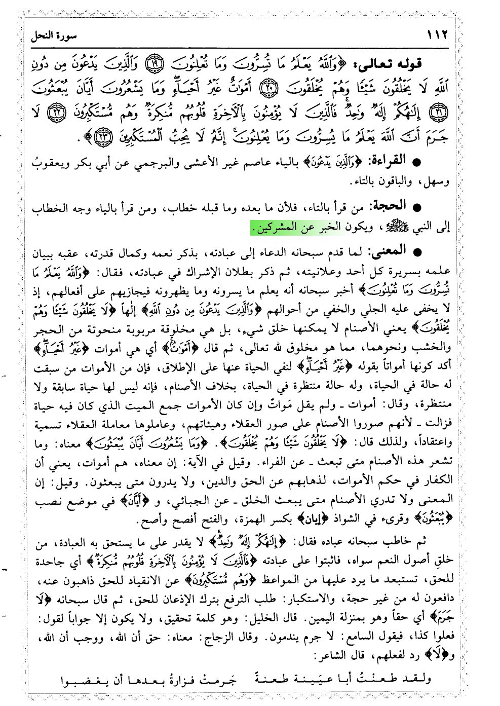 وَاللَّهُ یَعْلَمُ مَا تُسِرُّونَ وَمَا تُعْلِنُونَ﴿۱۹﴾ وَالَّذِینَ یَدْعُونَ مِنْ دُونِ اللَّهِ لا یَخْلُقُونَ شَیْئًا وَهُمْ یُخْلَقُونَ﴿۲۰﴾ أَمْوَاتٌ غَیْرُ أَحْیَاءٍ وَمَا یَشْعُرُونَ أَیَّانَ یُبْعَثُونَ﴿۲۱﴾ إِلَهُکُمْ إِلَهٌ وَاحِدٌ فَالَّذِینَ لا یُؤْمِنُونَ بِالآخِرَةِ قُلُوبُهُمْ مُنْکِرَةٌ وَهُمْ مُسْتَکْبِرُونَ﴿۲۲﴾ لا جَرَمَ أَنَّ اللَّهَ یَعْلَمُ مَا یُسِرُّونَ وَمَا یُعْلِنُونَ إِنَّهُ لا یُحِبُّ الْمُسْتَکْبِرِینَ﴿۲۳﴾