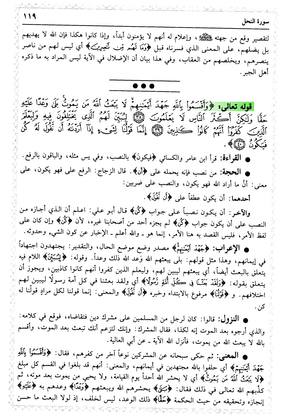 وَأَقْسَمُوا بِاللَّهِ جَهْدَ أَیْمَانِهِمْ لا یَبْعَثُ اللَّهُ مَنْ یَمُوتُ بَلَی وَعْدًا عَلَیْهِ حَقًّا وَلَکِنَّ أَکْثَرَ النَّاسِ لا یَعْلَمُونَ﴿۳۸﴾ لِیُبَیِّنَ لَهُمُ الَّذِی یَخْتَلِفُونَ فِیهِ وَلِیَعْلَمَ الَّذِینَ کَفَرُوا أَنَّهُمْ کَانُوا کَاذِبِینَ﴿۳۹﴾ إِنَّمَا قَوْلُنَا لِشَیْءٍ إِذَا أَرَدْنَاهُ أَنْ نَقُولَ لَهُ کُنْ فَیَکُونُ﴿۴۰﴾