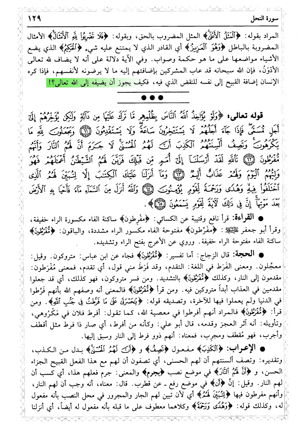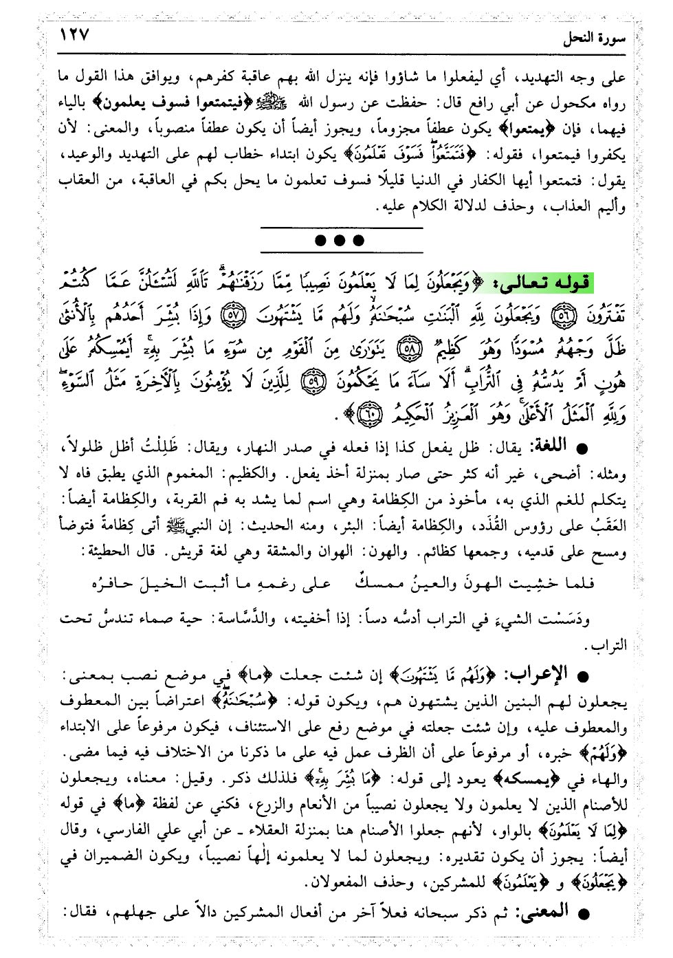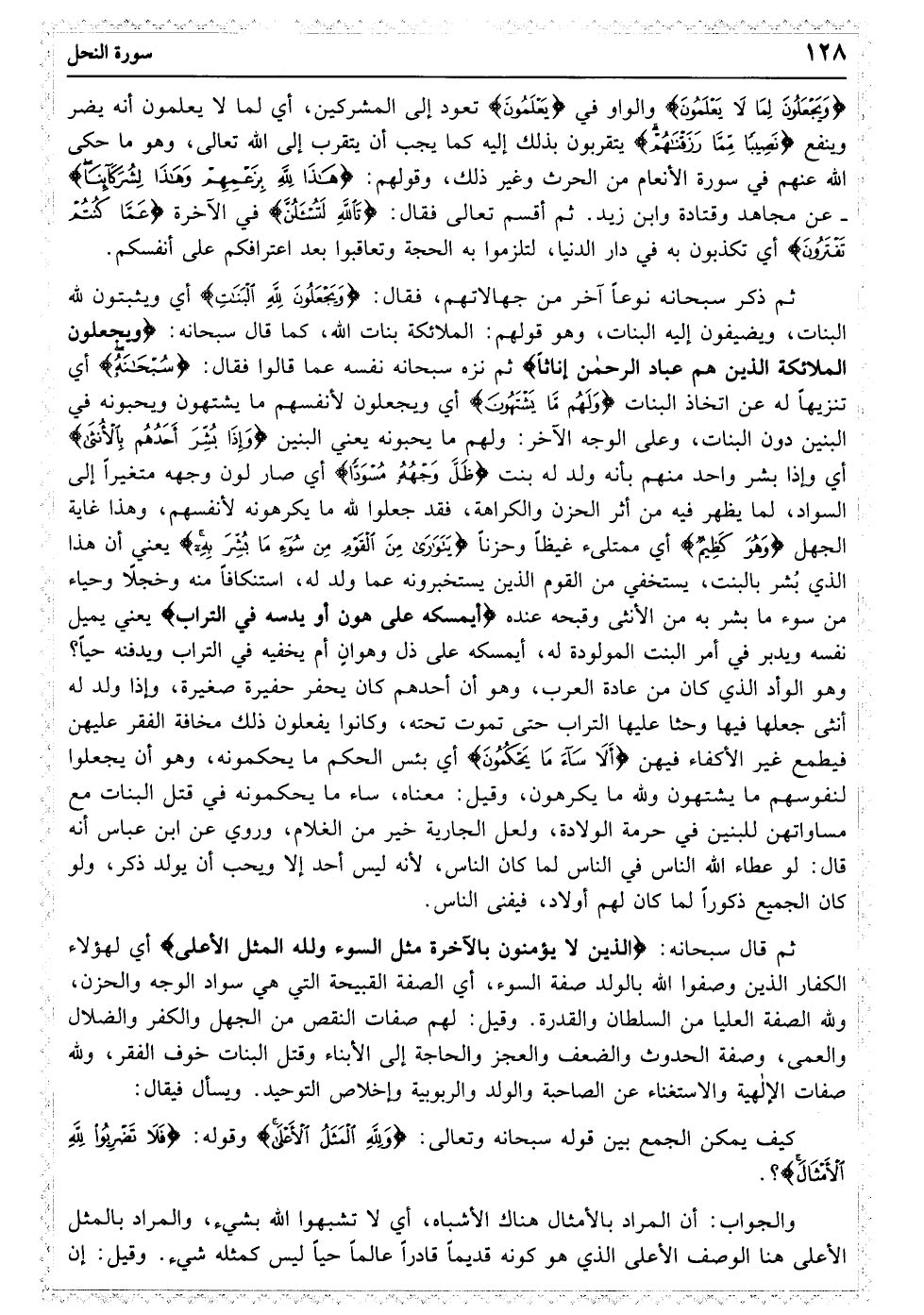 وَیَجْعَلُونَ لِمَا لا یَعْلَمُونَ نَصِیبًا مِمَّا رَزَقْنَاهُمْ تَاللَّهِ لَتُسْأَلُنَّ عَمَّا کُنْتُمْ تَفْتَرُونَ﴿۵۶﴾ وَیَجْعَلُونَ لِلَّهِ الْبَنَاتِ سُبْحَانَهُ وَلَهُمْ مَا یَشْتَهُونَ﴿۵۷﴾ وَإِذَا بُشِّرَ أَحَدُهُمْ بِالأنْثَی ظَلَّ وَجْهُهُ مُسْوَدًّا وَهُوَ کَظِیمٌ﴿۵۸﴾ یَتَوَارَی مِنَ الْقَوْمِ مِنْ سُوءِ مَا بُشِّرَ بِهِ أَیُمْسِکُهُ عَلَی هُونٍ أَمْ یَدُسُّهُ فِی التُّرَابِ أَلا سَاءَ مَا یَحْکُمُونَ﴿۵۹﴾ لِلَّذِینَ لا یُؤْمِنُونَ بِالآخِرَةِ مَثَلُ السَّوْءِ وَلِلَّهِ الْمَثَلُ الأعْلَی وَهُوَ الْعَزِیزُ الْحَکِیمُ﴿۶۰﴾