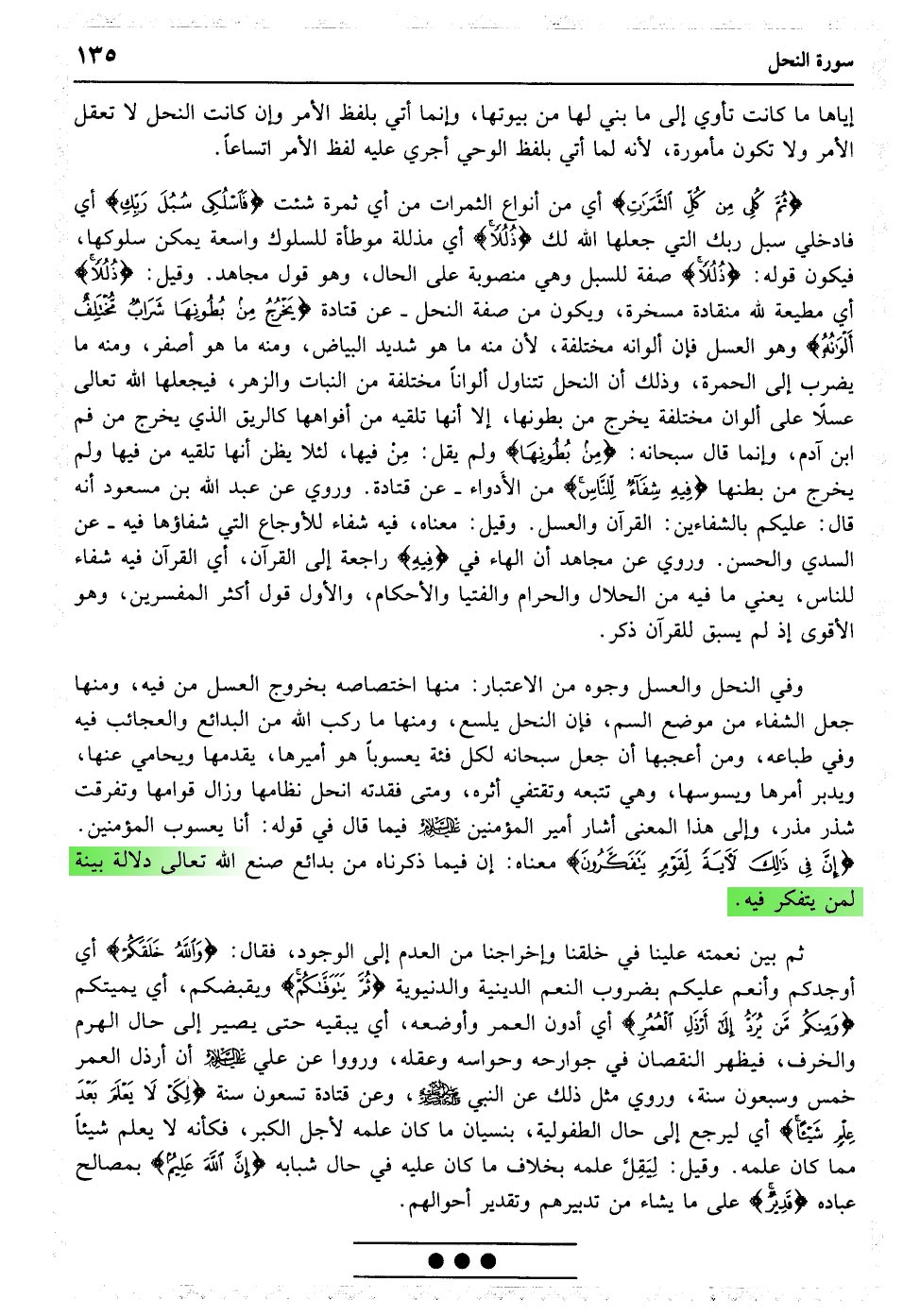 وَإِنَّ لَکُمْ فِی الأنْعَامِ لَعِبْرَةً نُسْقِیکُمْ مِمَّا فِی بُطُونِهِ مِنْ بَیْنِ فَرْثٍ وَدَمٍ لَبَنًا خَالِصًا سَائِغًا لِلشَّارِبِینَ﴿۶۶﴾ وَمِنْ ثَمَرَاتِ النَّخِیلِ وَالأعْنَابِ تَتَّخِذُونَ مِنْهُ سَکَرًا وَرِزْقًا حَسَنًا إِنَّ فِی ذَلِکَ لآیَةً لِقَوْمٍ یَعْقِلُونَ﴿۶۷﴾ وَأَوْحَی رَبُّکَ إِلَی النَّحْلِ أَنِ اتَّخِذِی مِنَ الْجِبَالِ بُیُوتًا وَمِنَ الشَّجَرِ وَمِمَّا یَعْرِشُونَ﴿۶۸﴾ ثُمَّ کُلِی مِنْ کُلِّ الثَّمَرَاتِ فَاسْلُکِی سُبُلَ رَبِّکِ ذُلُلا یَخْرُجُ مِنْ بُطُونِهَا شَرَابٌ مُخْتَلِفٌ أَلْوَانُهُ فِیهِ شِفَاءٌ لِلنَّاسِ إِنَّ فِی ذَلِکَ لآیَةً لِقَوْمٍ یَتَفَکَّرُونَ﴿۶۹﴾ وَاللَّهُ خَلَقَکُمْ ثُمَّ یَتَوَفَّاکُمْ وَمِنْکُمْ مَنْ یُرَدُّ إِلَی أَرْذَلِ الْعُمُرِ لِکَیْ لا یَعْلَمَ بَعْدَ عِلْمٍ شَیْئًا إِنَّ اللَّهَ عَلِیمٌ قَدِیرٌ﴿۷۰﴾