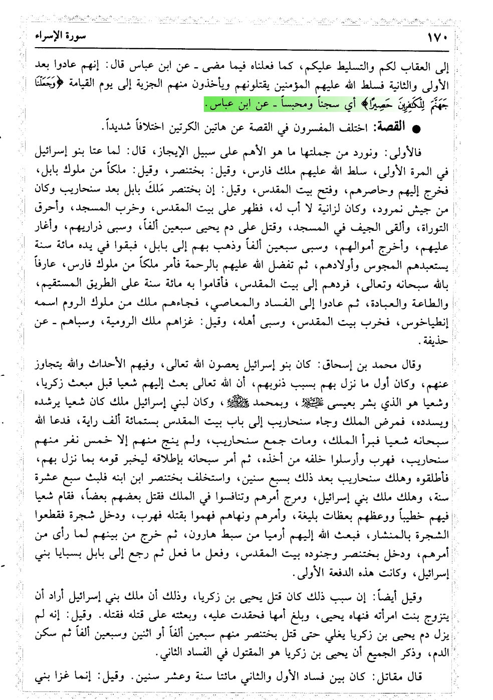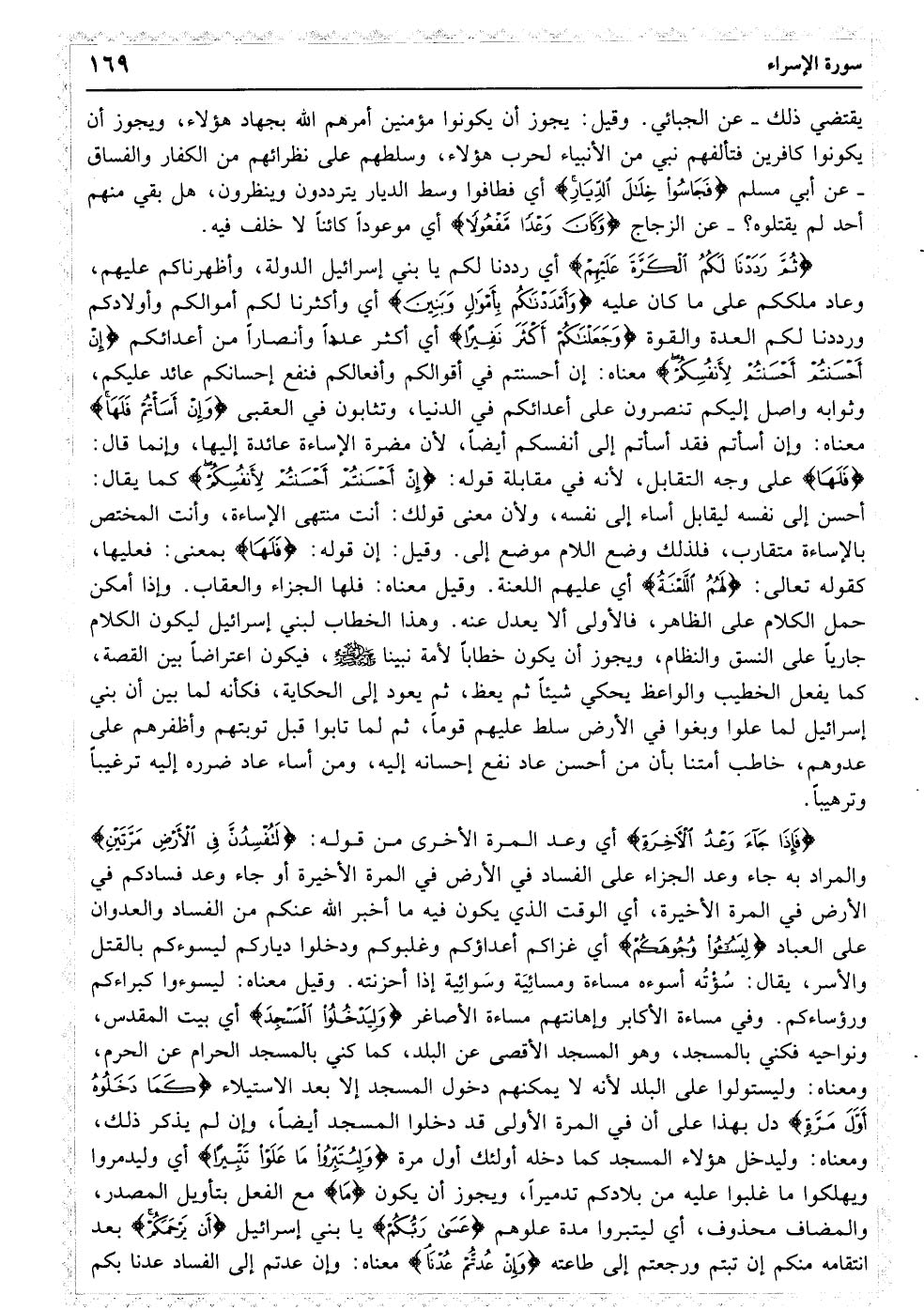 وَقَضَیْنَا إِلَی بَنِی إسْرائِیلَ فِی الْکِتَابِ لَتُفْسِدُنَّ فِی الأرْضِ مَرَّتَیْنِ وَلَتَعْلُنَّ عُلُوًّا کَبِیرًا﴿۴﴾ فَإِذَا جَاءَ وَعْدُ أُولاهُمَا بَعَثْنَا عَلَیْکُمْ عِبَادًا لَنَا أُولِی بَأْسٍ شَدِیدٍ فَجَاسُوا خِلالَ الدِّیَارِ وَکَانَ وَعْدًا مَفْعُولا﴿۵﴾ ثُمَّ رَدَدْنَا لَکُمُ الْکَرَّةَ عَلَیْهِمْ وَأَمْدَدْنَاکُمْ بِأَمْوَالٍ وَبَنِینَ وَجَعَلْنَاکُمْ أَکْثَرَ نَفِیرًا﴿۶﴾ إِنْ أَحْسَنْتُمْ أَحْسَنْتُمْ لأنْفُسِکُمْ وَإِنْ أَسَأْتُمْ فَلَهَا فَإِذَا جَاءَ وَعْدُ الآخِرَةِ لِیَسُوءُوا وُجُوهَکُمْ وَلِیَدْخُلُوا الْمَسْجِدَ کَمَا دَخَلُوهُ أَوَّلَ مَرَّةٍ وَلِیُتَبِّرُوا مَا عَلَوْا تَتْبِیرًا﴿۷﴾ عَسَی رَبُّکُمْ أَنْ یَرْحَمَکُمْ وَإِنْ عُدْتُمْ عُدْنَا وَجَعَلْنَا جَهَنَّمَ لِلْکَافِرِینَ حَصِیرًا﴿۸﴾