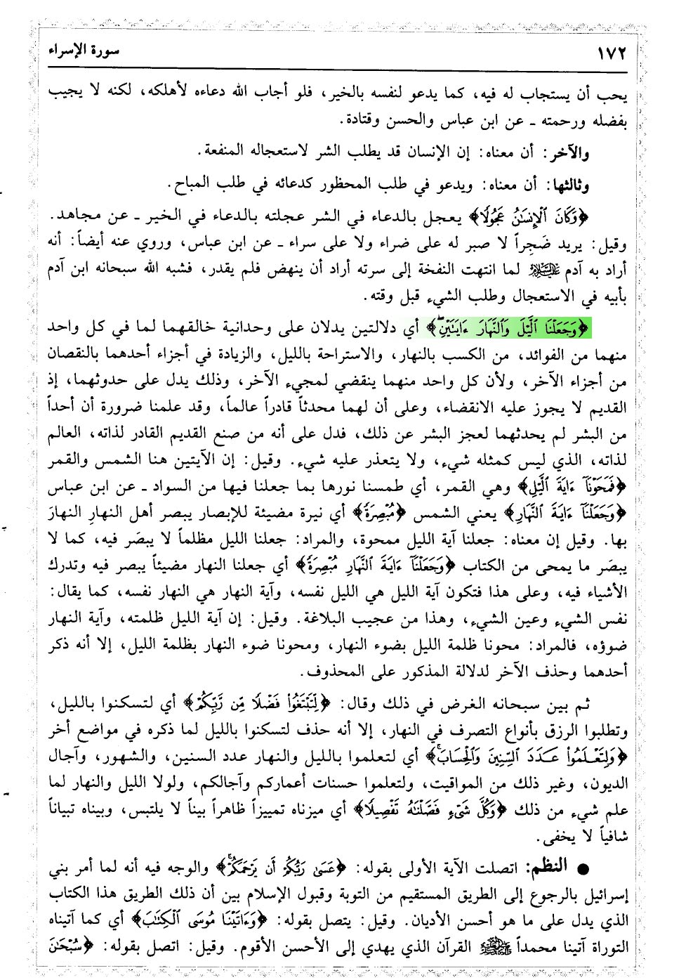 إِنَّ هَذَا الْقُرْآنَ یَهْدِی لِلَّتِی هِیَ أَقْوَمُ وَیُبَشِّرُ الْمُؤْمِنِینَ الَّذِینَ یَعْمَلُونَ الصَّالِحَاتِ أَنَّ لَهُمْ أَجْرًا کَبِیرًا﴿۹﴾ وَأَنَّ الَّذِینَ لا یُؤْمِنُونَ بِالآخِرَةِ أَعْتَدْنَا لَهُمْ عَذَابًا أَلِیمًا﴿۱۰﴾ وَیَدْعُ الإنْسَانُ بِالشَّرِّ دُعَاءَهُ بِالْخَیْرِ وَکَانَ الإنْسَانُ عَجُولا﴿۱۱﴾ وَجَعَلْنَا اللَّیْلَ وَالنَّهَارَ آیَتَیْنِ فَمَحَوْنَا آیَةَ اللَّیْلِ وَجَعَلْنَا آیَةَ النَّهَارِ مُبْصِرَةً لِتَبْتَغُوا فَضْلا مِنْ رَبِّکُمْ وَلِتَعْلَمُوا عَدَدَ السِّنِینَ وَالْحِسَابَ وَکُلَّ شَیْءٍ فَصَّلْنَاهُ تَفْصِیلا﴿۱۲﴾