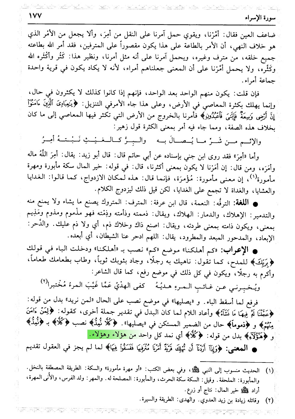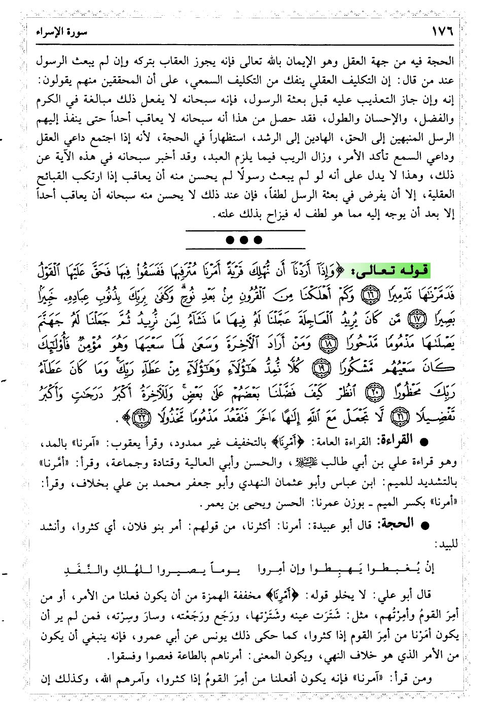 وَإِذَا أَرَدْنَا أَنْ نُهْلِکَ قَرْیَةً أَمَرْنَا مُتْرَفِیهَا فَفَسَقُوا فِیهَا فَحَقَّ عَلَیْهَا الْقَوْلُ فَدَمَّرْنَاهَا تَدْمِیرًا﴿۱۶﴾ وَکَمْ أَهْلَکْنَا مِنَ الْقُرُونِ مِنْ بَعْدِ نُوحٍ وَکَفَی بِرَبِّکَ بِذُنُوبِ عِبَادِهِ خَبِیرًا بَصِیرًا﴿۱۷﴾ مَنْ کَانَ یُرِیدُ الْعَاجِلَةَ عَجَّلْنَا لَهُ فِیهَا مَا نَشَاءُ لِمَنْ نُرِیدُ ثُمَّ جَعَلْنَا لَهُ جَهَنَّمَ یَصْلاهَا مَذْمُومًا مَدْحُورًا﴿۱۸﴾ وَمَنْ أَرَادَ الآخِرَةَ وَسَعَی لَهَا سَعْیَهَا وَهُوَ مُؤْمِنٌ فَأُولَئِکَ کَانَ سَعْیُهُمْ مَشْکُورًا﴿۱۹﴾ کُلا نُمِدُّ هَؤُلاءِ وَهَؤُلاءِ مِنْ عَطَاءِ رَبِّکَ وَمَا کَانَ عَطَاءُ رَبِّکَ مَحْظُورًا﴿۲۰﴾ انْظُرْ کَیْفَ فَضَّلْنَا بَعْضَهُمْ عَلَی بَعْضٍ وَلَلآخِرَةُ أَکْبَرُ دَرَجَاتٍ وَأَکْبَرُ تَفْضِیلا﴿۲۱﴾ لا تَجْعَلْ مَعَ اللَّهِ إِلَهًا آخَرَ فَتَقْعُدَ مَذْمُومًا مَخْذُولا﴿۲۲﴾
