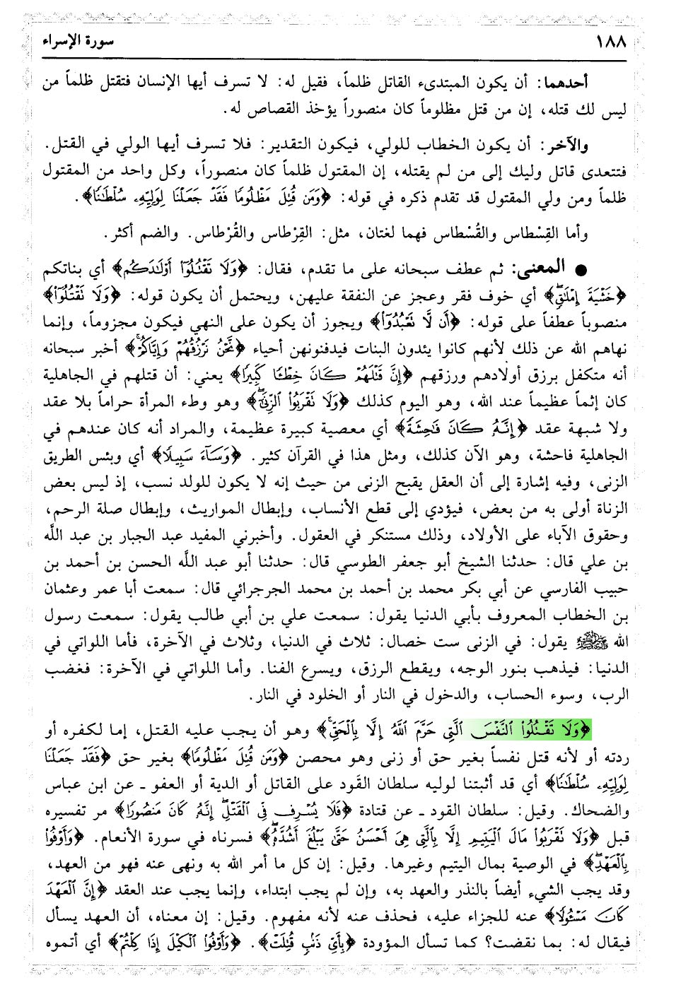 وَلا تَقْتُلُوا أَوْلادَکُمْ خَشْیَةَ إِمْلاقٍ نَحْنُ نَرْزُقُهُمْ وَإِیَّاکُمْ إِنَّ قَتْلَهُمْ کَانَ خِطْئًا کَبِیرًا﴿۳۱﴾ وَلا تَقْرَبُوا الزِّنَا إِنَّهُ کَانَ فَاحِشَةً وَسَاءَ سَبِیلا﴿۳۲﴾ وَلا تَقْتُلُوا النَّفْسَ الَّتِی حَرَّمَ اللَّهُ إِلا بِالْحَقِّ وَمَنْ قُتِلَ مَظْلُومًا فَقَدْ جَعَلْنَا لِوَلِیِّهِ سُلْطَانًا فَلا یُسْرِفْ فِی الْقَتْلِ إِنَّهُ کَانَ مَنْصُورًا﴿۳۳﴾ وَلا تَقْرَبُوا مَالَ الْیَتِیمِ إِلا بِالَّتِی هِیَ أَحْسَنُ حَتَّی یَبْلُغَ أَشُدَّهُ وَأَوْفُوا بِالْعَهْدِ إِنَّ الْعَهْدَ کَانَ مَسْئُولا﴿۳۴﴾ وَأَوْفُوا الْکَیْلَ إِذَا کِلْتُمْ وَزِنُوا بِالْقِسْطَاسِ الْمُسْتَقِیمِ ذَلِکَ خَیْرٌ وَأَحْسَنُ تَأْوِیلا﴿۳۵﴾