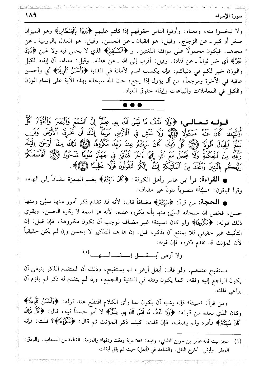 وَلا تَقْفُ مَا لَیْسَ لَکَ بِهِ عِلْمٌ إِنَّ السَّمْعَ وَالْبَصَرَ وَالْفُؤَادَ کُلُّ أُولَئِکَ کَانَ عَنْهُ مَسْئُولا﴿۳۶﴾ وَلا تَمْشِ فِی الأرْضِ مَرَحًا إِنَّکَ لَنْ تَخْرِقَ الأرْضَ وَلَنْ تَبْلُغَ الْجِبَالَ طُولا﴿۳۷﴾ کُلُّ ذَلِکَ کَانَ سَیِّئُهُ عِنْدَ رَبِّکَ مَکْرُوهًا﴿۳۸﴾ ذَلِکَ مِمَّا أَوْحَی إِلَیْکَ رَبُّکَ مِنَ الْحِکْمَةِ وَلا تَجْعَلْ مَعَ اللَّهِ إِلَهًا آخَرَ فَتُلْقَی فِی جَهَنَّمَ مَلُومًا مَدْحُورًا﴿۳۹﴾ أَفَأَصْفَاکُمْ رَبُّکُمْ بِالْبَنِینَ وَاتَّخَذَ مِنَ الْمَلائِکَةِ إِنَاثًا إِنَّکُمْ لَتَقُولُونَ قَوْلا عَظِیمًا﴿۴۰﴾
