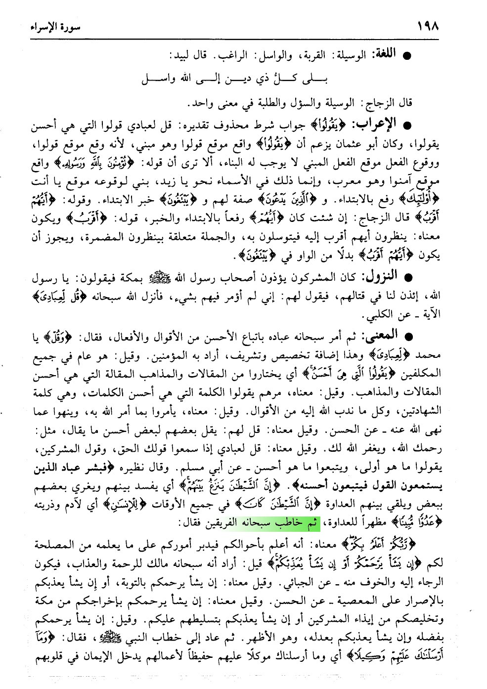 وَقُلْ لِعِبَادِی یَقُولُوا الَّتِی هِیَ أَحْسَنُ إِنَّ الشَّیْطَانَ یَنْزَغُ بَیْنَهُمْ إِنَّ الشَّیْطَانَ کَانَ لِلإنْسَانِ عَدُوًّا مُبِینًا﴿۵۳﴾ رَبُّکُمْ أَعْلَمُ بِکُمْ إِنْ یَشَأْ یَرْحَمْکُمْ أَوْ إِنْ یَشَأْ یُعَذِّبْکُمْ وَمَا أَرْسَلْنَاکَ عَلَیْهِمْ وَکِیلا﴿۵۴﴾ وَرَبُّکَ أَعْلَمُ بِمَنْ فِی السَّمَاوَاتِ وَالأرْضِ وَلَقَدْ فَضَّلْنَا بَعْضَ النَّبِیِّینَ عَلَی بَعْضٍ وَآتَیْنَا دَاوُدَ زَبُورًا﴿۵۵﴾ قُلِ ادْعُوا الَّذِینَ زَعَمْتُمْ مِنْ دُونِهِ فَلا یَمْلِکُونَ کَشْفَ الضُّرِّ عَنْکُمْ وَلا تَحْوِیلا﴿۵۶﴾ أُولَئِکَ الَّذِینَ یَدْعُونَ یَبْتَغُونَ إِلَی رَبِّهِمُ الْوَسِیلَةَ أَیُّهُمْ أَقْرَبُ وَیَرْجُونَ رَحْمَتَهُ وَیَخَافُونَ عَذَابَهُ إِنَّ عَذَابَ رَبِّکَ کَانَ مَحْذُورًا﴿۵۷﴾