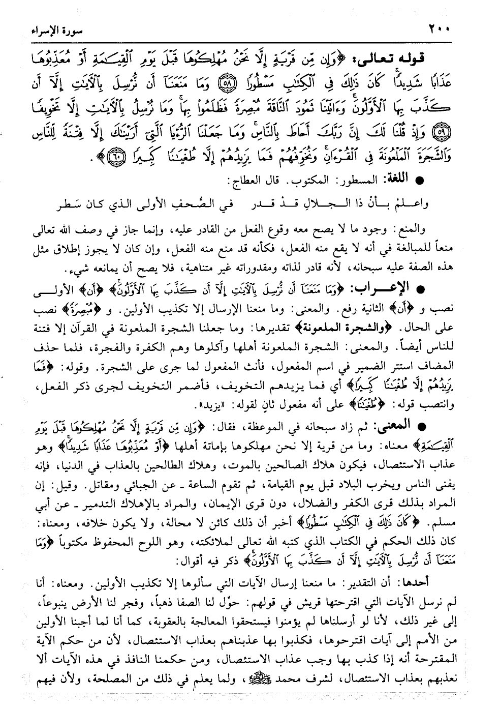 وَإِنْ مِنْ قَرْیَةٍ إِلا نَحْنُ مُهْلِکُوهَا قَبْلَ یَوْمِ الْقِیَامَةِ أَوْ مُعَذِّبُوهَا عَذَابًا شَدِیدًا کَانَ ذَلِکَ فِی الْکِتَابِ مَسْطُورًا﴿۵۸﴾ وَمَا مَنَعَنَا أَنْ نُرْسِلَ بِالآیَاتِ إِلا أَنْ کَذَّبَ بِهَا الأوَّلُونَ وَآتَیْنَا ثَمُودَ النَّاقَةَ مُبْصِرَةً فَظَلَمُوا بِهَا وَمَا نُرْسِلُ بِالآیَاتِ إِلا تَخْوِیفًا﴿۵۹﴾ وَإِذْ قُلْنَا لَکَ إِنَّ رَبَّکَ أَحَاطَ بِالنَّاسِ وَمَا جَعَلْنَا الرُّؤْیَا الَّتِی أَرَیْنَاکَ إِلا فِتْنَةً لِلنَّاسِ وَالشَّجَرَةَ الْمَلْعُونَةَ فِی الْقُرْآنِ وَنُخَوِّفُهُمْ فَمَا یَزِیدُهُمْ إِلا طُغْیَانًا کَبِیرًا﴿۶۰﴾