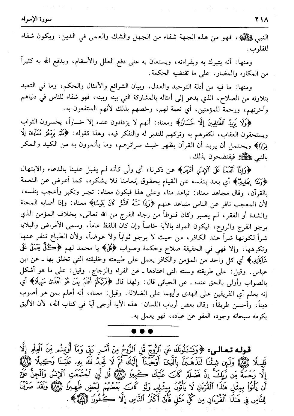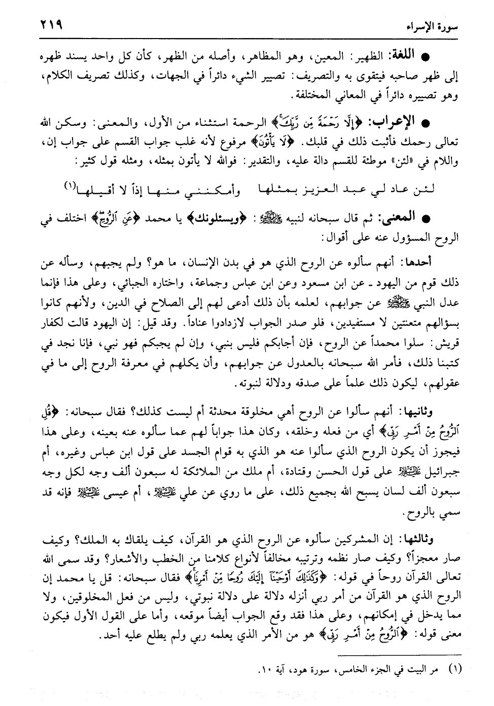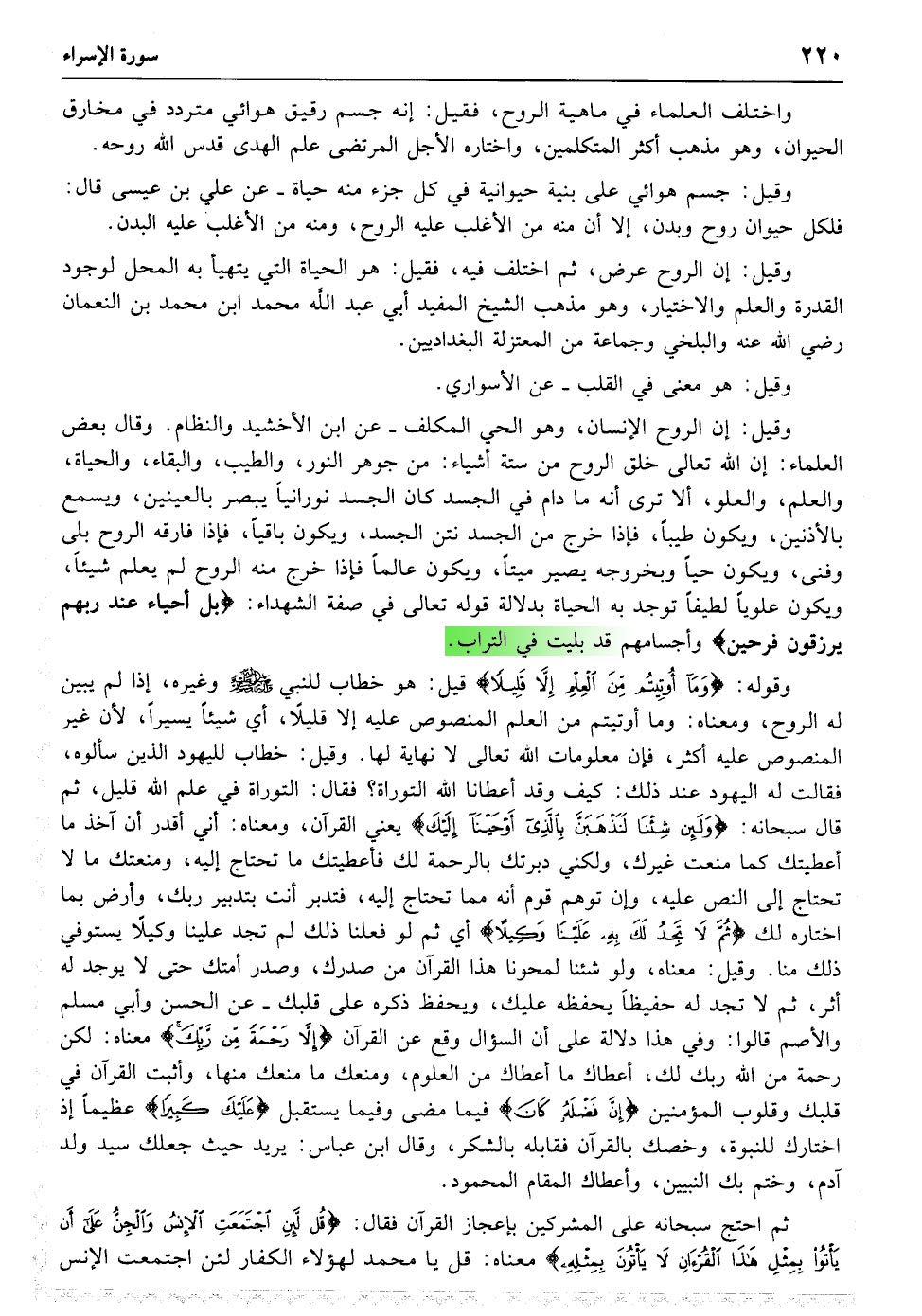وَیَسْأَلُونَکَ عَنِ الرُّوحِ قُلِ الرُّوحُ مِنْ أَمْرِ رَبِّی وَمَا أُوتِیتُمْ مِنَ الْعِلْمِ إِلا قَلِیلا﴿۸۵﴾ وَلَئِنْ شِئْنَا لَنَذْهَبَنَّ بِالَّذِی أَوْحَیْنَا إِلَیْکَ ثُمَّ لا تَجِدُ لَکَ بِهِ عَلَیْنَا وَکِیلا﴿۸۶﴾ إِلا رَحْمَةً مِنْ رَبِّکَ إِنَّ فَضْلَهُ کَانَ عَلَیْکَ کَبِیرًا﴿۸۷﴾ قُلْ لَئِنِ اجْتَمَعَتِ الإنْسُ وَالْجِنُّ عَلَی أَنْ یَأْتُوا بِمِثْلِ هَذَا الْقُرْآنِ لا یَأْتُونَ بِمِثْلِهِ وَلَوْ کَانَ بَعْضُهُمْ لِبَعْضٍ ظَهِیرًا﴿۸۸﴾ وَلَقَدْ صَرَّفْنَا لِلنَّاسِ فِی هَذَا الْقُرْآنِ مِنْ کُلِّ مَثَلٍ فَأَبَی أَکْثَرُ النَّاسِ إِلا کُفُورًا﴿۸۹﴾