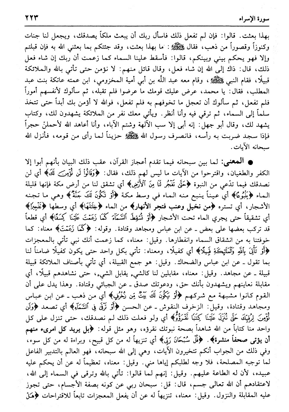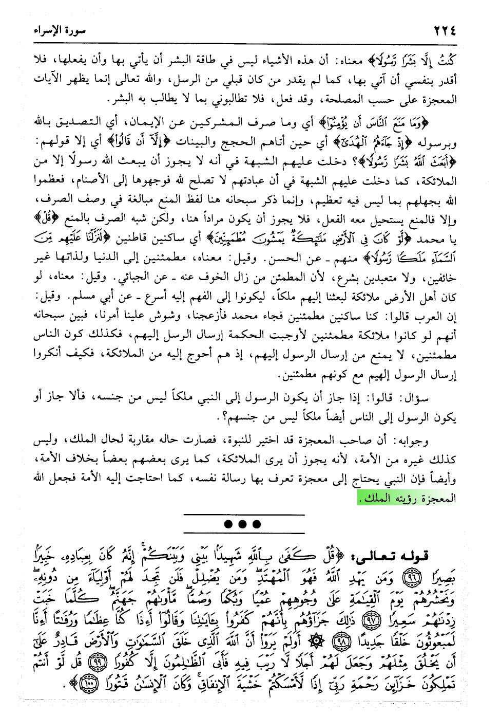 وَقَالُوا لَنْ نُؤْمِنَ لَکَ حَتَّی تَفْجُرَ لَنَا مِنَ الأرْضِ یَنْبُوعًا﴿۹۰﴾ أَوْ تَکُونَ لَکَ جَنَّةٌ مِنْ نَخِیلٍ وَعِنَبٍ فَتُفَجِّرَ الأنْهَارَ خِلالَهَا تَفْجِیرًا﴿۹۱﴾ أَوْ تُسْقِطَ السَّمَاءَ کَمَا زَعَمْتَ عَلَیْنَا کِسَفًا أَوْ تَأْتِیَ بِاللَّهِ وَالْمَلائِکَةِ قَبِیلا﴿۹۲﴾ أَوْ یَکُونَ لَکَ بَیْتٌ مِنْ زُخْرُفٍ أَوْ تَرْقَی فِی السَّمَاءِ وَلَنْ نُؤْمِنَ لِرُقِیِّکَ حَتَّی تُنَزِّلَ عَلَیْنَا کِتَابًا نَقْرَؤُهُ قُلْ سُبْحَانَ رَبِّی هَلْ کُنْتُ إِلا بَشَرًا رَسُولا﴿۹۳﴾ وَمَا مَنَعَ النَّاسَ أَنْ یُؤْمِنُوا إِذْ جَاءَهُمُ الْهُدَی إِلا أَنْ قَالُوا أَبَعَثَ اللَّهُ بَشَرًا رَسُولا﴿۹۴﴾ قُلْ لَوْ کَانَ فِی الأرْضِ مَلائِکَةٌ یَمْشُونَ مُطْمَئِنِّینَ لَنَزَّلْنَا عَلَیْهِمْ مِنَ السَّمَاءِ مَلَکًا رَسُولا﴿۹۵﴾