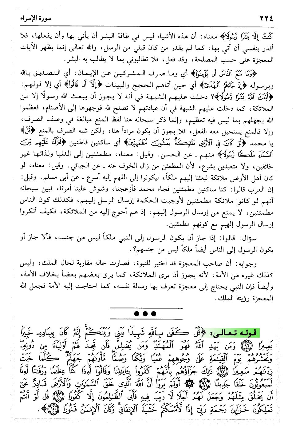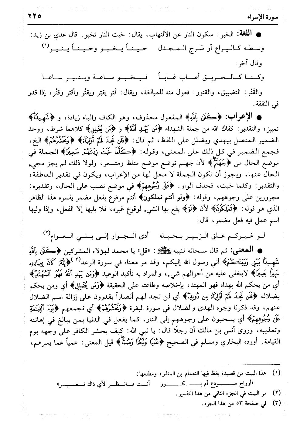 قُلْ کَفَی بِاللَّهِ شَهِیدًا بَیْنِی وَبَیْنَکُمْ إِنَّهُ کَانَ بِعِبَادِهِ خَبِیرًا بَصِیرًا﴿۹۶﴾ وَمَنْ یَهْدِ اللَّهُ فَهُوَ الْمُهْتَدِ وَمَنْ یُضْلِلْ فَلَنْ تَجِدَ لَهُمْ أَوْلِیَاءَ مِنْ دُونِهِ وَنَحْشُرُهُمْ یَوْمَ الْقِیَامَةِ عَلَی وُجُوهِهِمْ عُمْیًا وَبُکْمًا وَصُمًّا مَأْوَاهُمْ جَهَنَّمُ کُلَّمَا خَبَتْ زِدْنَاهُمْ سَعِیرًا﴿۹۷﴾ ذَلِکَ جَزَاؤُهُمْ بِأَنَّهُمْ کَفَرُوا بِآیَاتِنَا وَقَالُوا أَئِذَا کُنَّا عِظَامًا وَرُفَاتًا أَئِنَّا لَمَبْعُوثُونَ خَلْقًا جَدِیدًا﴿۹۸﴾ أَوَلَمْ یَرَوْا أَنَّ اللَّهَ الَّذِی خَلَقَ السَّمَاوَاتِ وَالأرْضَ قَادِرٌ عَلَی أَنْ یَخْلُقَ مِثْلَهُمْ وَجَعَلَ لَهُمْ أَجَلا لا رَیْبَ فِیهِ فَأَبَی الظَّالِمُونَ إِلا کُفُورًا﴿۹۹﴾ قُلْ لَوْ أَنْتُمْ تَمْلِکُونَ خَزَائِنَ رَحْمَةِ رَبِّی إِذًا لأمْسَکْتُمْ خَشْیَةَ الإنْفَاقِ وَکَانَ الإنْسَانُ قَتُورًا﴿۱۰۰﴾