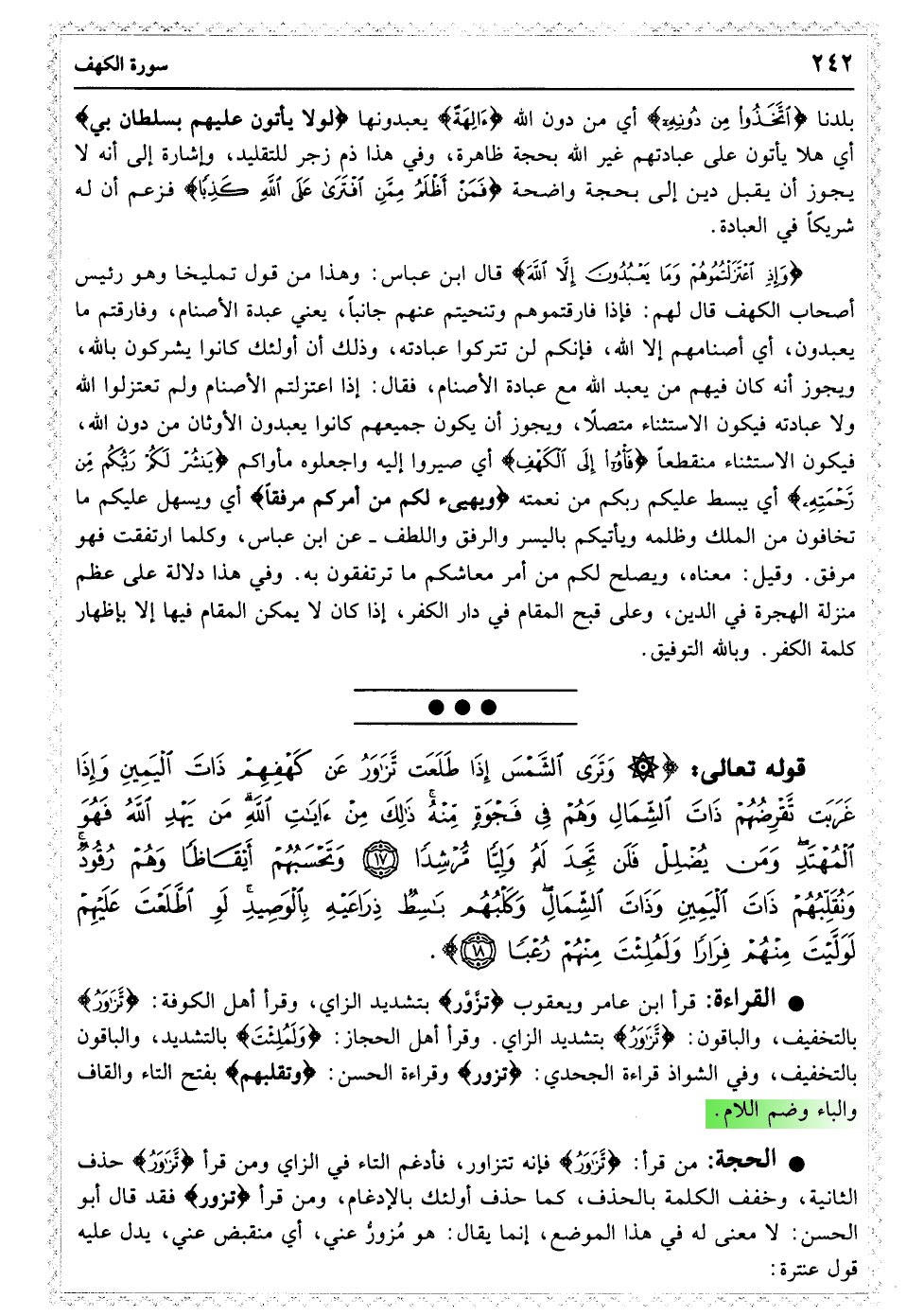وَتَرَی الشَّمْسَ إِذَا طَلَعَتْ تَزَاوَرُ عَنْ کَهْفِهِمْ ذَاتَ الْیَمِینِ وَإِذَا غَرَبَتْ تَقْرِضُهُمْ ذَاتَ الشِّمَالِ وَهُمْ فِی فَجْوَةٍ مِنْهُ ذَلِکَ مِنْ آیَاتِ اللَّهِ مَنْ یَهْدِ اللَّهُ فَهُوَ الْمُهْتَدِ وَمَنْ یُضْلِلْ فَلَنْ تَجِدَ لَهُ وَلِیًّا مُرْشِدًا﴿۱۷﴾ وَتَحْسَبُهُمْ أَیْقَاظًا وَهُمْ رُقُودٌ وَنُقَلِّبُهُمْ ذَاتَ الْیَمِینِ وَذَاتَ الشِّمَالِ وَکَلْبُهُمْ بَاسِطٌ ذِرَاعَیْهِ بِالْوَصِیدِ لَوِ اطَّلَعْتَ عَلَیْهِمْ لَوَلَّیْتَ مِنْهُمْ فِرَارًا وَلَمُلِئْتَ مِنْهُمْ رُعْبًا﴿۱۸﴾