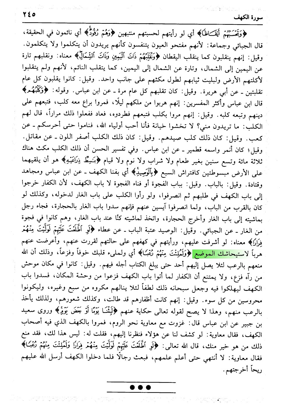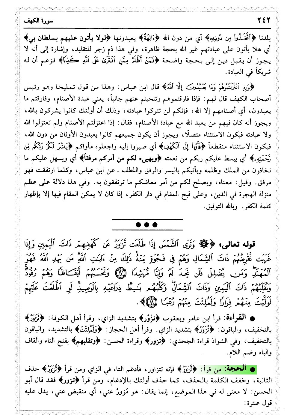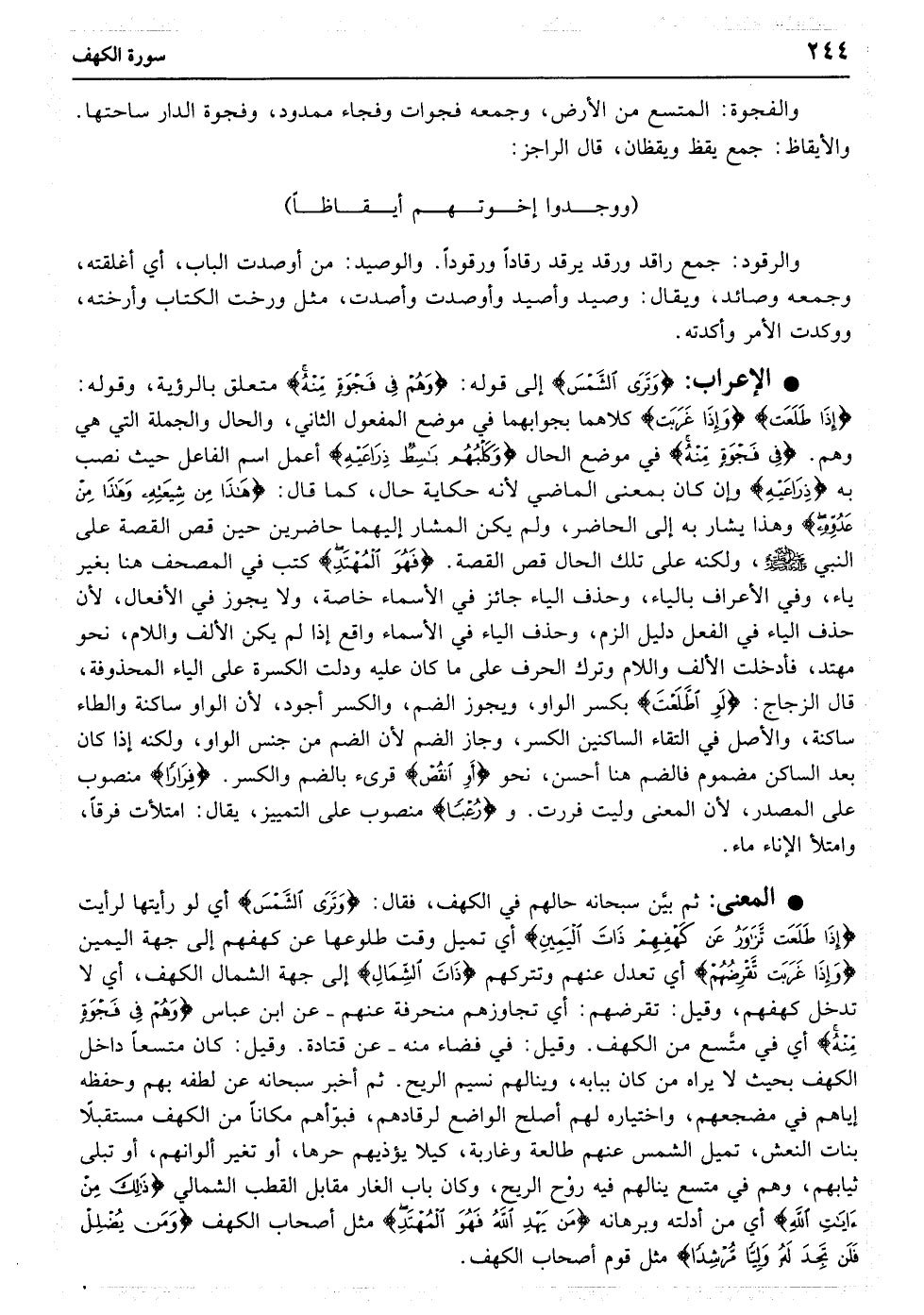 وَتَرَی الشَّمْسَ إِذَا طَلَعَتْ تَزَاوَرُ عَنْ کَهْفِهِمْ ذَاتَ الْیَمِینِ وَإِذَا غَرَبَتْ تَقْرِضُهُمْ ذَاتَ الشِّمَالِ وَهُمْ فِی فَجْوَةٍ مِنْهُ ذَلِکَ مِنْ آیَاتِ اللَّهِ مَنْ یَهْدِ اللَّهُ فَهُوَ الْمُهْتَدِ وَمَنْ یُضْلِلْ فَلَنْ تَجِدَ لَهُ وَلِیًّا مُرْشِدًا﴿۱۷﴾ وَتَحْسَبُهُمْ أَیْقَاظًا وَهُمْ رُقُودٌ وَنُقَلِّبُهُمْ ذَاتَ الْیَمِینِ وَذَاتَ الشِّمَالِ وَکَلْبُهُمْ بَاسِطٌ ذِرَاعَیْهِ بِالْوَصِیدِ لَوِ اطَّلَعْتَ عَلَیْهِمْ لَوَلَّیْتَ مِنْهُمْ فِرَارًا وَلَمُلِئْتَ مِنْهُمْ رُعْبًا﴿۱۸﴾