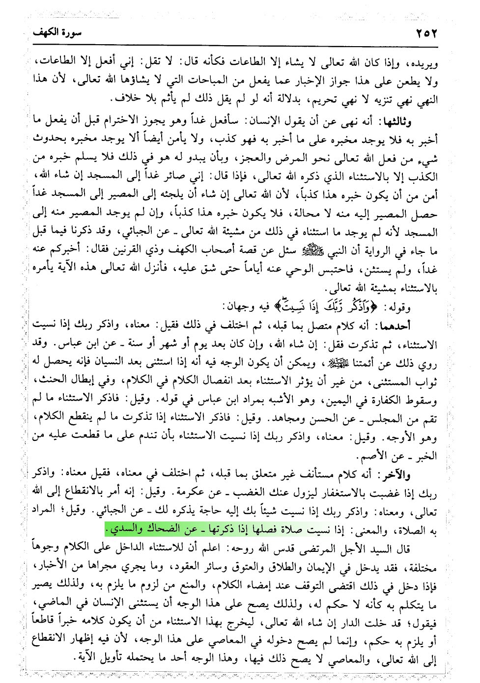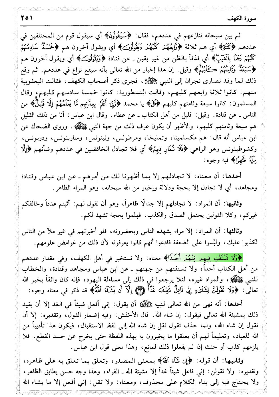 کَذَلِکَ أَعْثَرْنَا عَلَیْهِمْ لِیَعْلَمُوا أَنَّ وَعْدَ اللَّهِ حَقٌّ وَأَنَّ السَّاعَةَ لا رَیْبَ فِیهَا إِذْ یَتَنَازَعُونَ بَیْنَهُمْ أَمْرَهُمْ فَقَالُوا ابْنُوا عَلَیْهِمْ بُنْیَانًا رَبُّهُمْ أَعْلَمُ بِهِمْ قَالَ الَّذِینَ غَلَبُوا عَلَی أَمْرِهِمْ لَنَتَّخِذَنَّ عَلَیْهِمْ مَسْجِدًا﴿۲۱﴾ سَیَقُولُونَ ثَلاثَةٌ رَابِعُهُمْ کَلْبُهُمْ وَیَقُولُونَ خَمْسَةٌ سَادِسُهُمْ کَلْبُهُمْ رَجْمًا بِالْغَیْبِ وَیَقُولُونَ سَبْعَةٌ وَثَامِنُهُمْ کَلْبُهُمْ قُلْ رَبِّی أَعْلَمُ بِعِدَّتِهِمْ مَا یَعْلَمُهُمْ إِلا قَلِیلٌ فَلا تُمَارِ فِیهِمْ إِلا مِرَاءً ظَاهِرًا وَلا تَسْتَفْتِ فِیهِمْ مِنْهُمْ أَحَدًا﴿۲۲﴾ وَلا تَقُولَنَّ لِشَیْءٍ إِنِّی فَاعِلٌ ذَلِکَ غَدًا﴿۲۳﴾ إِلا أَنْ یَشَاءَ اللَّهُ وَاذْکُرْ رَبَّکَ إِذَا نَسِیتَ وَقُلْ عَسَی أَنْ یَهْدِیَنِ رَبِّی لأقْرَبَ مِنْ هَذَا رَشَدًا﴿۲۴﴾