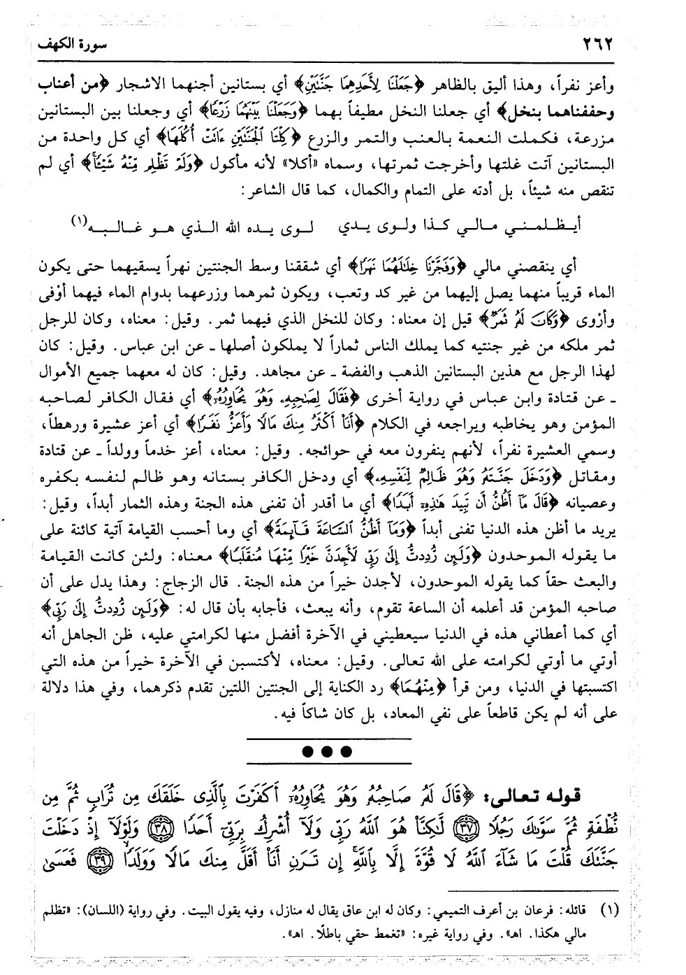 وَاضْرِبْ لَهُمْ مَثَلا رَجُلَیْنِ جَعَلْنَا لأحَدِهِمَا جَنَّتَیْنِ مِنْ أَعْنَابٍ وَحَفَفْنَاهُمَا بِنَخْلٍ وَجَعَلْنَا بَیْنَهُمَا زَرْعًا﴿۳۲﴾ کِلْتَا الْجَنَّتَیْنِ آتَتْ أُکُلَهَا وَلَمْ تَظْلِمْ مِنْهُ شَیْئًا وَفَجَّرْنَا خِلالَهُمَا نَهَرًا﴿۳۳﴾ وَکَانَ لَهُ ثَمَرٌ فَقَالَ لِصَاحِبِهِ وَهُوَ یُحَاوِرُهُ أَنَا أَکْثَرُ مِنْکَ مَالا وَأَعَزُّ نَفَرًا﴿۳۴﴾ وَدَخَلَ جَنَّتَهُ وَهُوَ ظَالِمٌ لِنَفْسِهِ قَالَ مَا أَظُنُّ أَنْ تَبِیدَ هَذِهِ أَبَدًا﴿۳۵﴾ وَمَا أَظُنُّ السَّاعَةَ قَائِمَةً وَلَئِنْ رُدِدْتُ إِلَی رَبِّی لأجِدَنَّ خَیْرًا مِنْهَا مُنْقَلَبًا﴿۳۶﴾