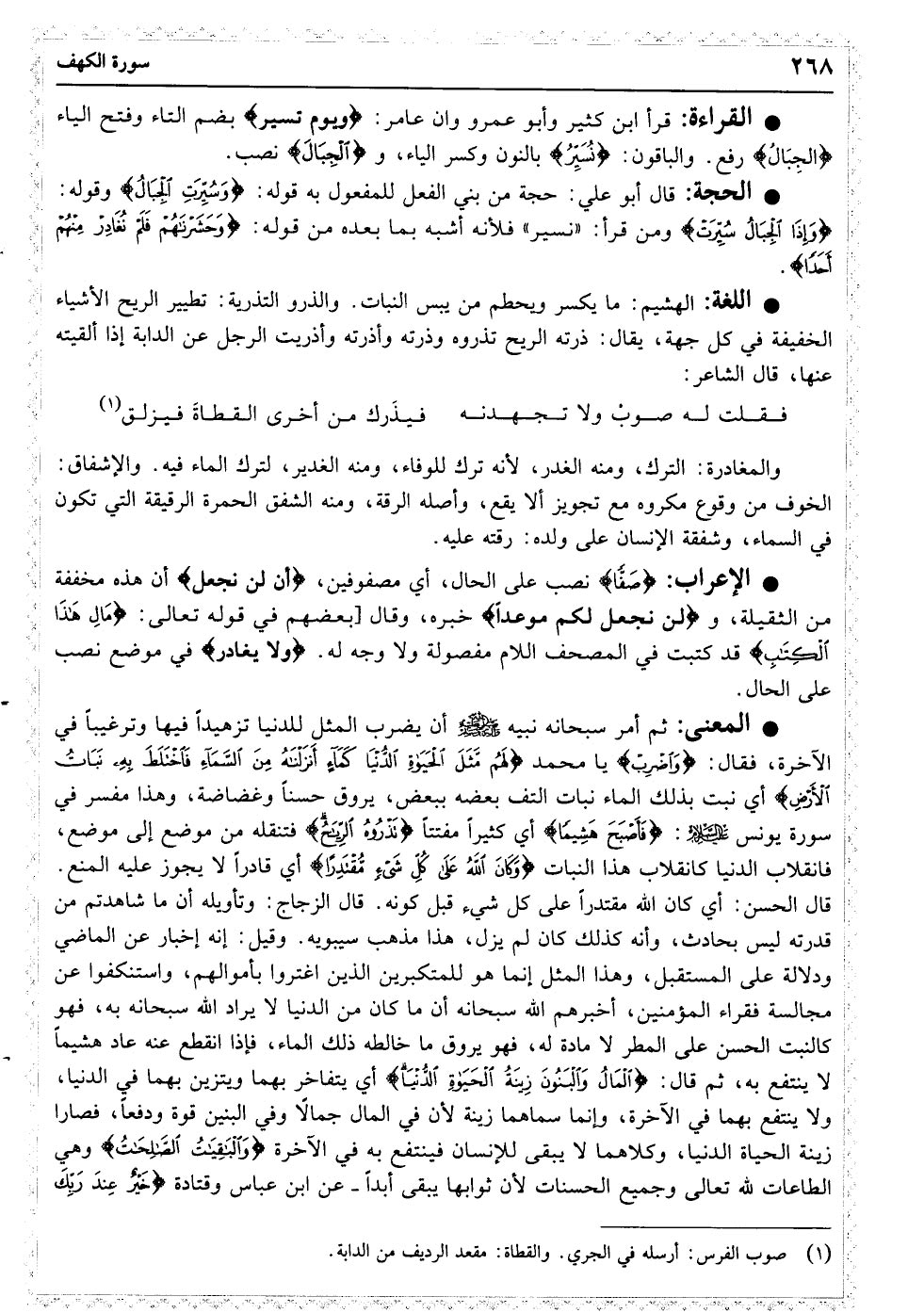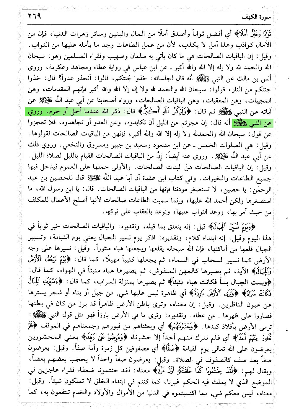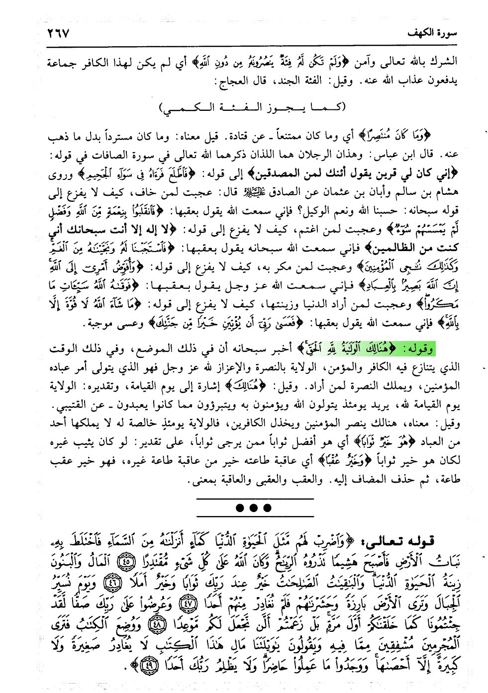 وَاضْرِبْ لَهُمْ مَثَلَ الْحَیَاةِ الدُّنْیَا کَمَاءٍ أَنْزَلْنَاهُ مِنَ السَّمَاءِ فَاخْتَلَطَ بِهِ نَبَاتُ الأرْضِ فَأَصْبَحَ هَشِیمًا تَذْرُوهُ الرِّیَاحُ وَکَانَ اللَّهُ عَلَی کُلِّ شَیْءٍ مُقْتَدِرًا﴿۴۵﴾ الْمَالُ وَالْبَنُونَ زِینَةُ الْحَیَاةِ الدُّنْیَا وَالْبَاقِیَاتُ الصَّالِحَاتُ خَیْرٌ عِنْدَ رَبِّکَ ثَوَابًا وَخَیْرٌ أَمَلا﴿۴۶﴾ وَیَوْمَ نُسَیِّرُ الْجِبَالَ وَتَرَی الأرْضَ بَارِزَةً وَحَشَرْنَاهُمْ فَلَمْ نُغَادِرْ مِنْهُمْ أَحَدًا﴿۴۷﴾ وَعُرِضُوا عَلَی رَبِّکَ صَفًّا لَقَدْ جِئْتُمُونَا کَمَا خَلَقْنَاکُمْ أَوَّلَ مَرَّةٍ بَلْ زَعَمْتُمْ أَلَّنْ نَجْعَلَ لَکُمْ مَوْعِدًا﴿۴۸﴾ وَوُضِعَ الْکِتَابُ فَتَرَی الْمُجْرِمِینَ مُشْفِقِینَ مِمَّا فِیهِ وَیَقُولُونَ یَا وَیْلَتَنَا مَالِ هَذَا الْکِتَابِ لا یُغَادِرُ صَغِیرَةً وَلا کَبِیرَةً إِلا أَحْصَاهَا وَوَجَدُوا مَا عَمِلُوا حَاضِرًا وَلا یَظْلِمُ رَبُّکَ أَحَدًا﴿۴۹﴾