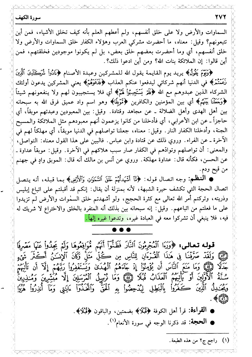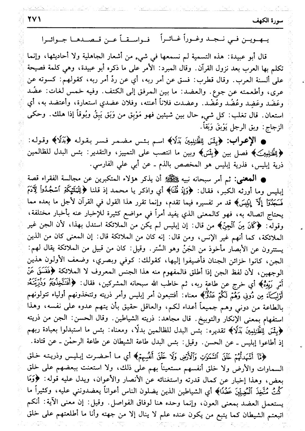 وَإِذْ قُلْنَا لِلْمَلائِکَةِ اسْجُدُوا لآدَمَ فَسَجَدُوا إِلا إِبْلِیسَ کَانَ مِنَ الْجِنِّ فَفَسَقَ عَنْ أَمْرِ رَبِّهِ أَفَتَتَّخِذُونَهُ وَذُرِّیَّتَهُ أَوْلِیَاءَ مِنْ دُونِی وَهُمْ لَکُمْ عَدُوٌّ بِئْسَ لِلظَّالِمِینَ بَدَلا﴿۵۰﴾ مَا أَشْهَدْتُهُمْ خَلْقَ السَّمَاوَاتِ وَالأرْضِ وَلا خَلْقَ أَنْفُسِهِمْ وَمَا کُنْتُ مُتَّخِذَ الْمُضِلِّینَ عَضُدًا﴿۵۱﴾ وَیَوْمَ یَقُولُ نَادُوا شُرَکَائِیَ الَّذِینَ زَعَمْتُمْ فَدَعَوْهُمْ فَلَمْ یَسْتَجِیبُوا لَهُمْ وَجَعَلْنَا بَیْنَهُمْ مَوْبِقًا﴿۵۲﴾