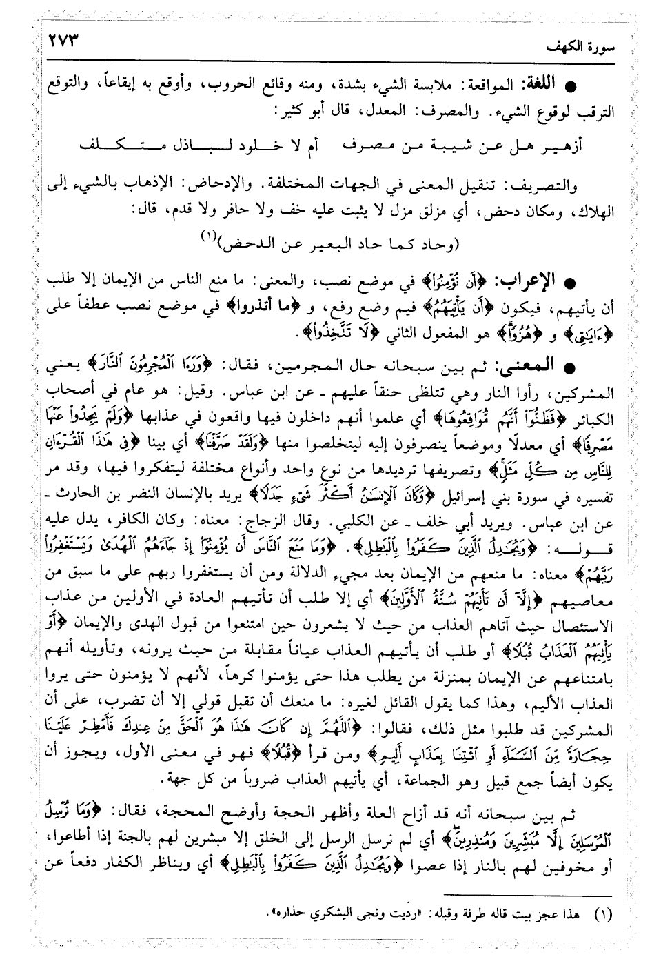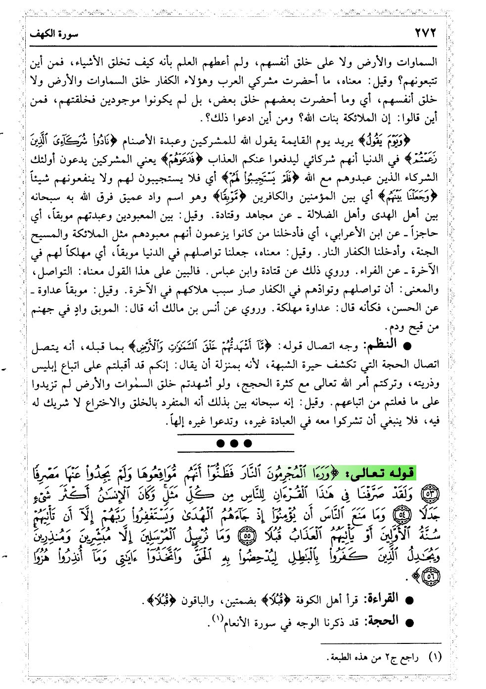 وَرَأَی الْمُجْرِمُونَ النَّارَ فَظَنُّوا أَنَّهُمْ مُوَاقِعُوهَا وَلَمْ یَجِدُوا عَنْهَا مَصْرِفًا﴿۵۳﴾ وَلَقَدْ صَرَّفْنَا فِی هَذَا الْقُرْآنِ لِلنَّاسِ مِنْ کُلِّ مَثَلٍ وَکَانَ الإنْسَانُ أَکْثَرَ شَیْءٍ جَدَلا﴿۵۴﴾ وَمَا مَنَعَ النَّاسَ أَنْ یُؤْمِنُوا إِذْ جَاءَهُمُ الْهُدَی وَیَسْتَغْفِرُوا رَبَّهُمْ إِلا أَنْ تَأْتِیَهُمْ سُنَّةُ الأوَّلِینَ أَوْ یَأْتِیَهُمُ الْعَذَابُ قُبُلا﴿۵۵﴾ وَمَا نُرْسِلُ الْمُرْسَلِینَ إِلا مُبَشِّرِینَ وَمُنْذِرِینَ وَیُجَادِلُ الَّذِینَ کَفَرُوا بِالْبَاطِلِ لِیُدْحِضُوا بِهِ الْحَقَّ وَاتَّخَذُوا آیَاتِی وَمَا أُنْذِرُوا هُزُوًا﴿۵۶﴾