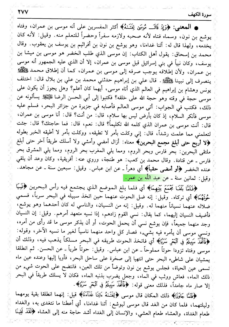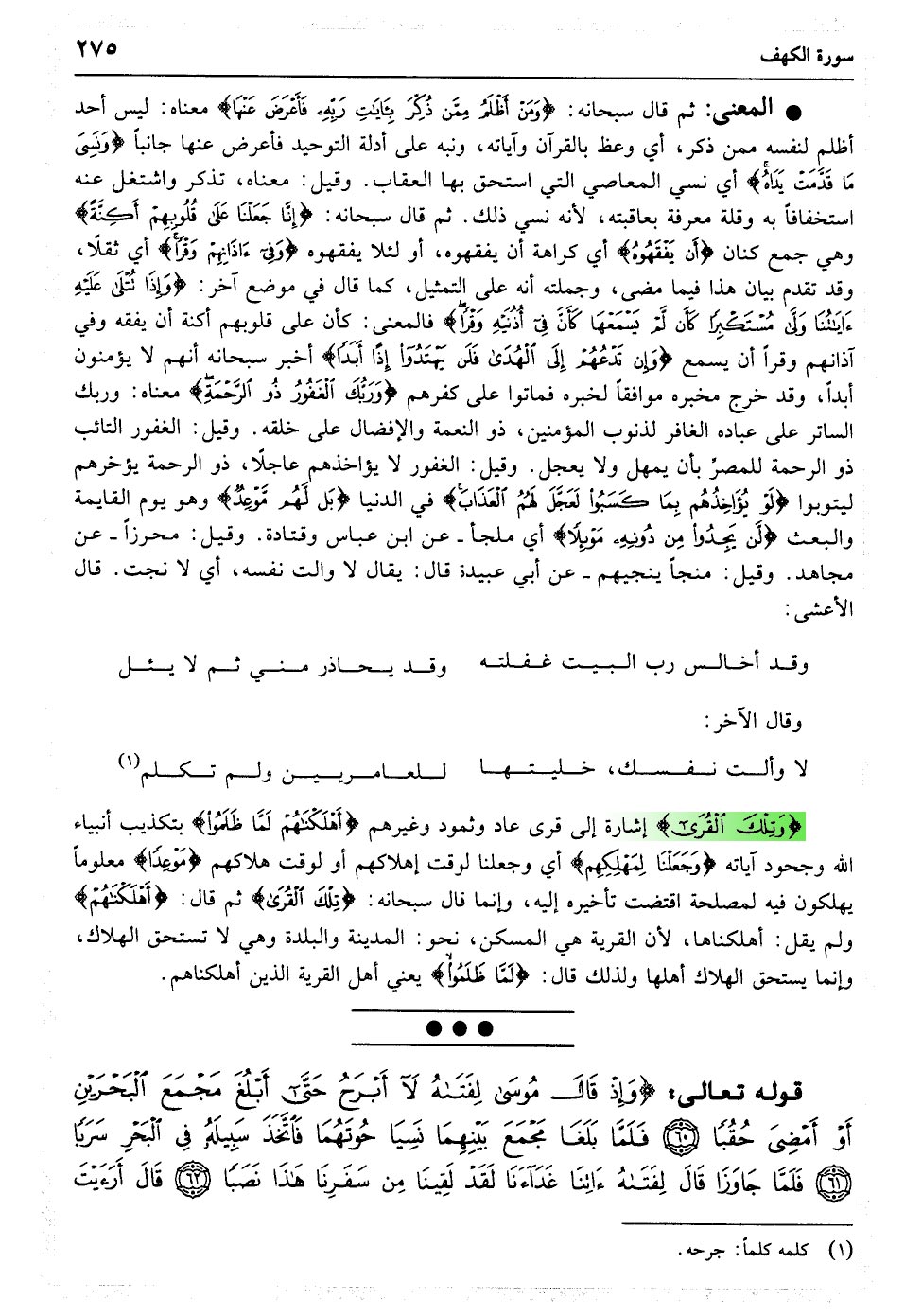 وَإِذْ قَالَ مُوسَی لِفَتَاهُ لا أَبْرَحُ حَتَّی أَبْلُغَ مَجْمَعَ الْبَحْرَیْنِ أَوْ أَمْضِیَ حُقُبًا﴿۶۰﴾ فَلَمَّا بَلَغَا مَجْمَعَ بَیْنِهِمَا نَسِیَا حُوتَهُمَا فَاتَّخَذَ سَبِیلَهُ فِی الْبَحْرِ سَرَبًا﴿۶۱﴾ فَلَمَّا جَاوَزَا قَالَ لِفَتَاهُ آتِنَا غَدَاءَنَا لَقَدْ لَقِینَا مِنْ سَفَرِنَا هَذَا نَصَبًا﴿۶۲﴾ قَالَ أَرَأَیْتَ إِذْ أَوَیْنَا إِلَی الصَّخْرَةِ فَإِنِّی نَسِیتُ الْحُوتَ وَمَا أَنْسَانِیهُ إِلا الشَّیْطَانُ أَنْ أَذْکُرَهُ وَاتَّخَذَ سَبِیلَهُ فِی الْبَحْرِ عَجَبًا﴿۶۳﴾ قَالَ ذَلِکَ مَا کُنَّا نَبْغِ فَارْتَدَّا عَلَی آثَارِهِمَا قَصَصًا﴿۶۴﴾